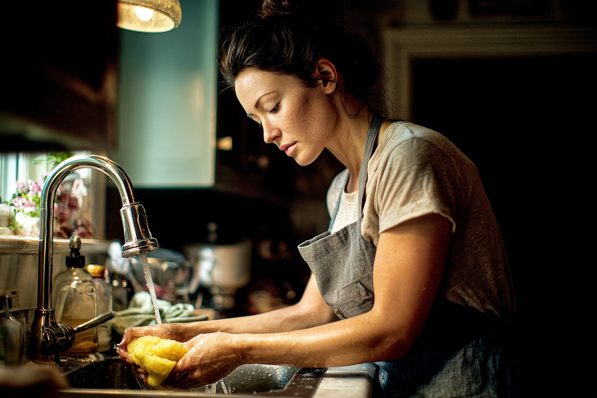 Плитка и раковина. Точечно обработайте самые «жёлтые» зоны, разотрите губкой, затем тщательно смойте и вытрите насухо.
