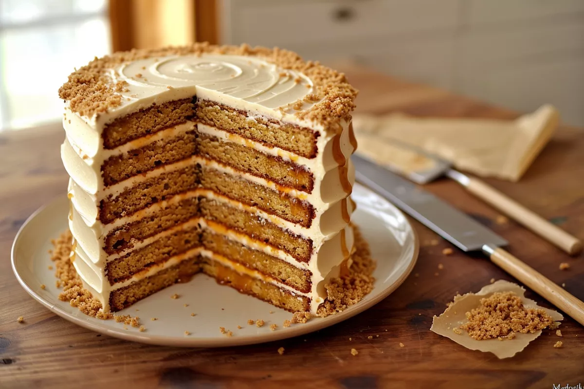 Мини-советы для результата: ориентируйтесь на цвет — тёмно-карамельный даёт насыщенный вкус; берите плотную сметану, чтобы крем не поплыл; крошку делайте мелкой — так обсыпка ложится ровно. Высокий медовик режьте узкими полосками: тонкий срез держит форму и выглядит эффектно.