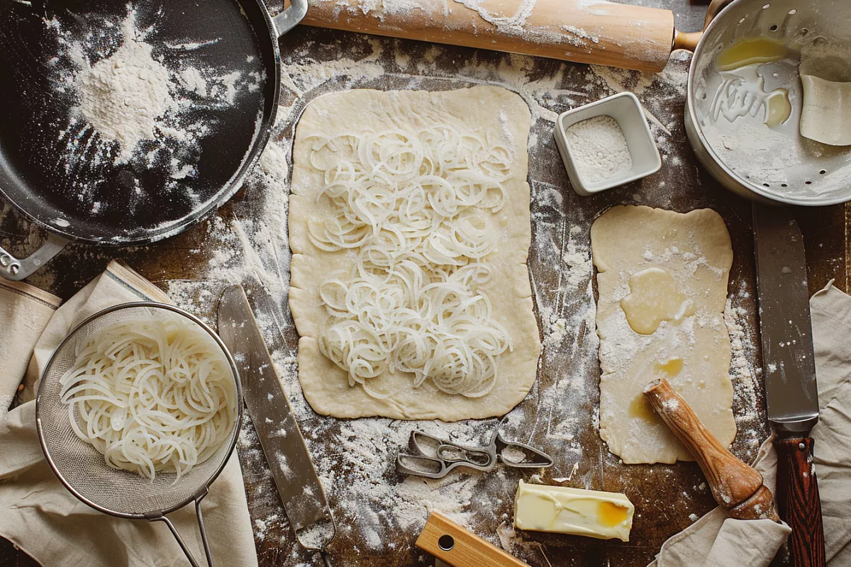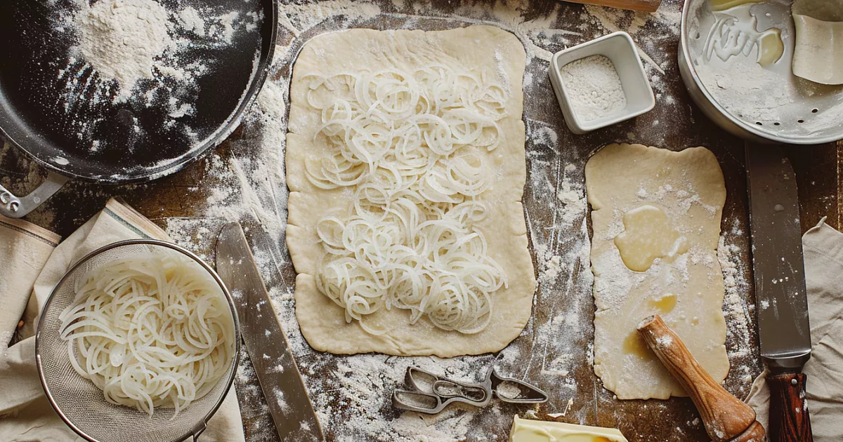 Пять самых простых продуктов — и у вас на столе ароматная луковая лепёшка с тонкими слоями. Секрет — мягкое тесто, очень тонкая нарезка лука и аккуратная формовка рулетом с последующим «прессом».