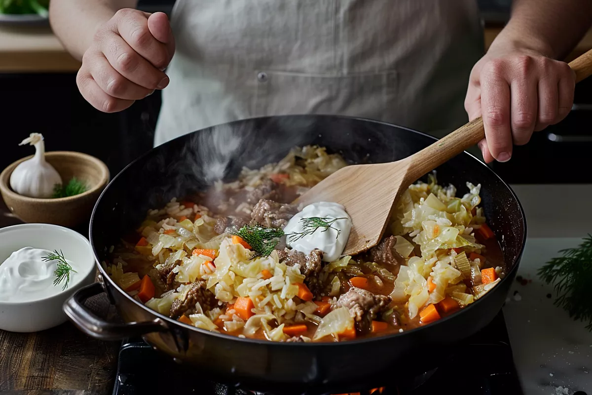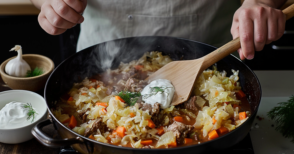 Подавайте щедро, в глубокой тарелке, с холодной сметаной и рубленым укропом — контраст температуры подчёркивает мясной сок. Советы по ходу: недоваренный рис лучше держит форму, капусту не трогайте первые минуты — так она карамелизуется, а щепотка сахара ускорит румянец без сладости во вкусе.