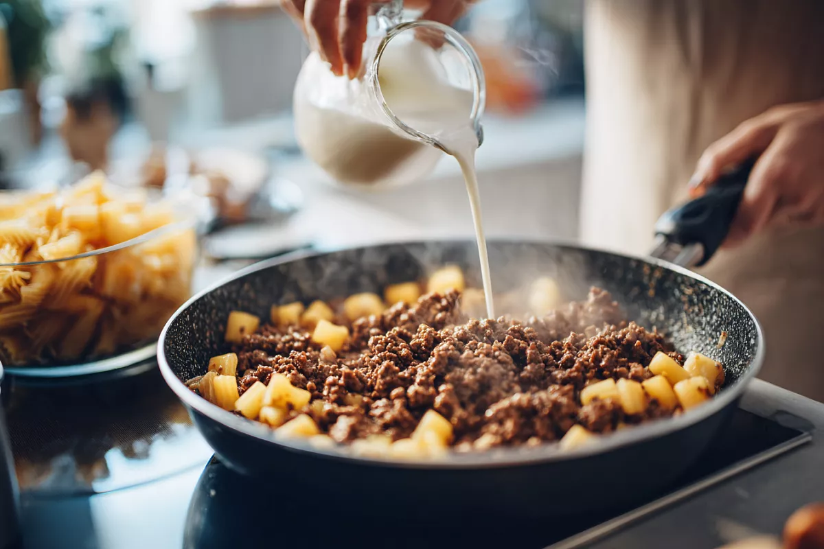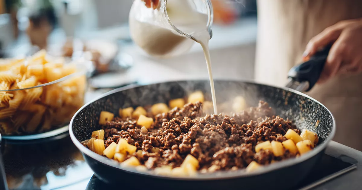 Жарьте лук терпеливо — именно румянец даёт сладость и балансирует мясо. Молоко или сливки вводите в два шага: фарш впитывает влагу равномернее и остаётся сочным. Макароны выбирайте некрупные — их удобнее смешивать с мясом.