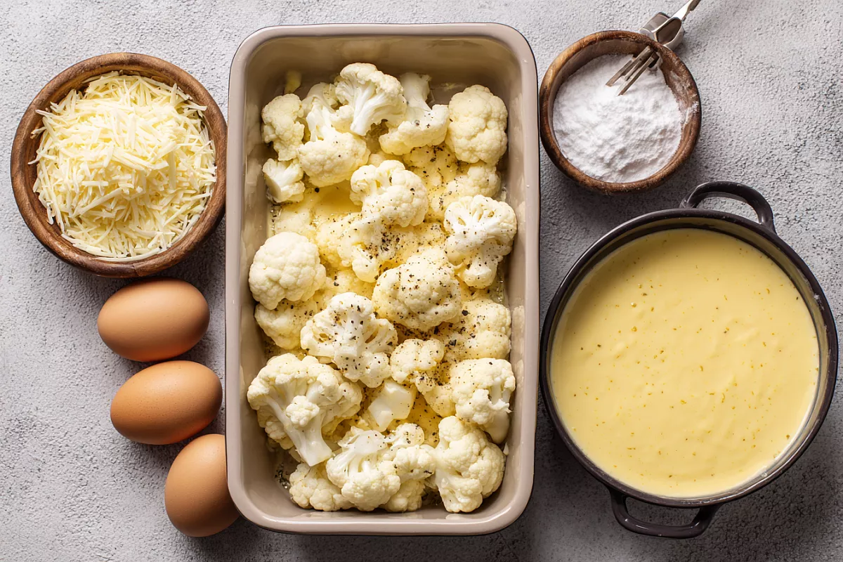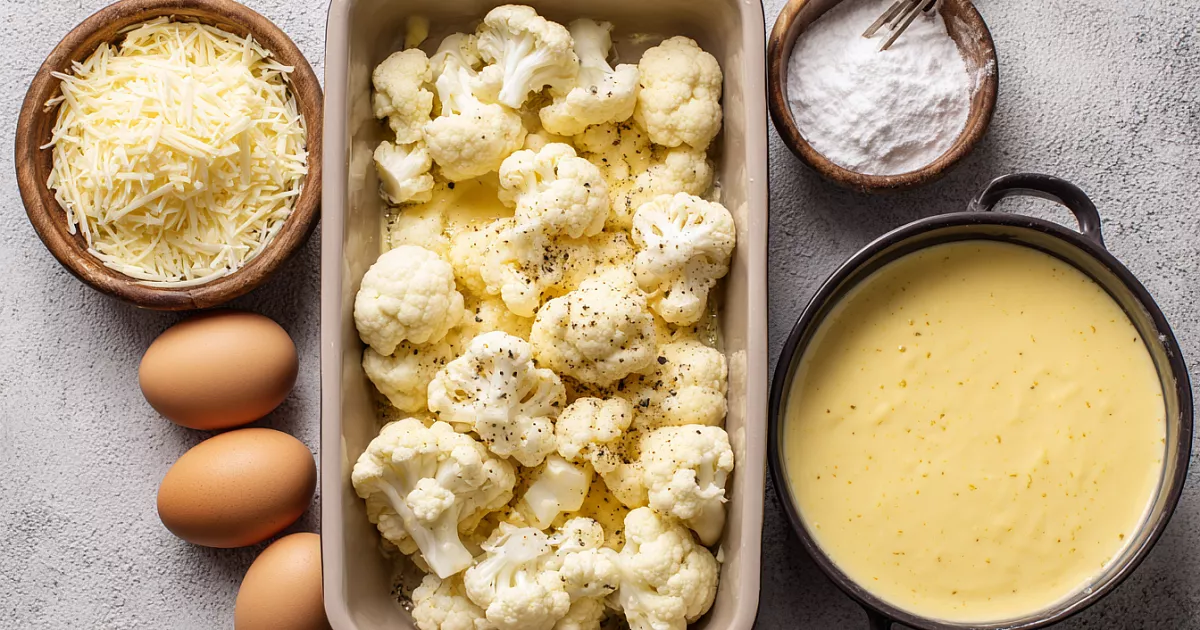 Форму (30 × 20 см) смажьте маслом, уложите соцветия одним слоем. Залейте смесью, присыпьте тёртым сыром. Выпекайте при 180 °C 15–20 минут до румяной корочки, ориентируйтесь на свою духовку.