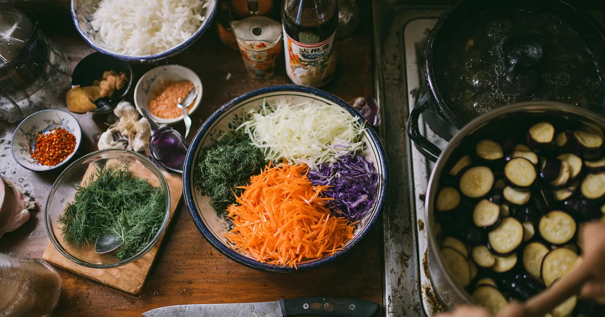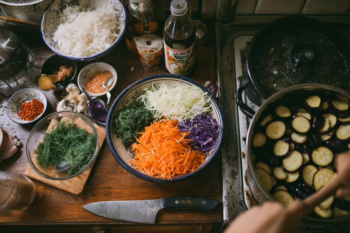 Берём 1 кг баклажанов, нарезаем ломтиками «с пальчик» (около 1 см толщиной), обязательно оставляя шкурку, чтобы они держали форму. Кипятим воду в 6-литровой кастрюле, бланшируем баклажаны ровно 3 минуты, затем сразу перекладываем в холодную воду, чтобы остановить варку. Отжимаем, но не сильно, чтобы не получилась каша. Нарезаем 2 средние луковицы (полукольцами), 1 морковь (200 г, соломкой, слегка присолить), 1 огурец (средний, соломкой), половину красного болгарского перца (100 г, соломкой). Перец можно взять жёлтый или зелёный для разнообразия.
