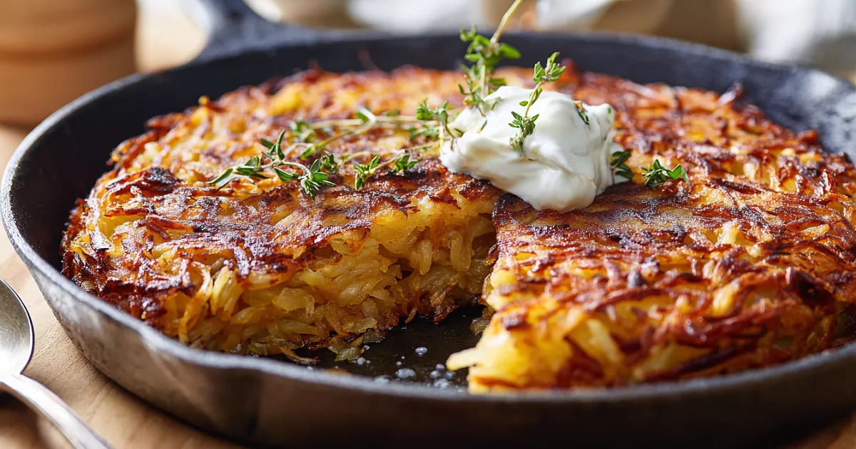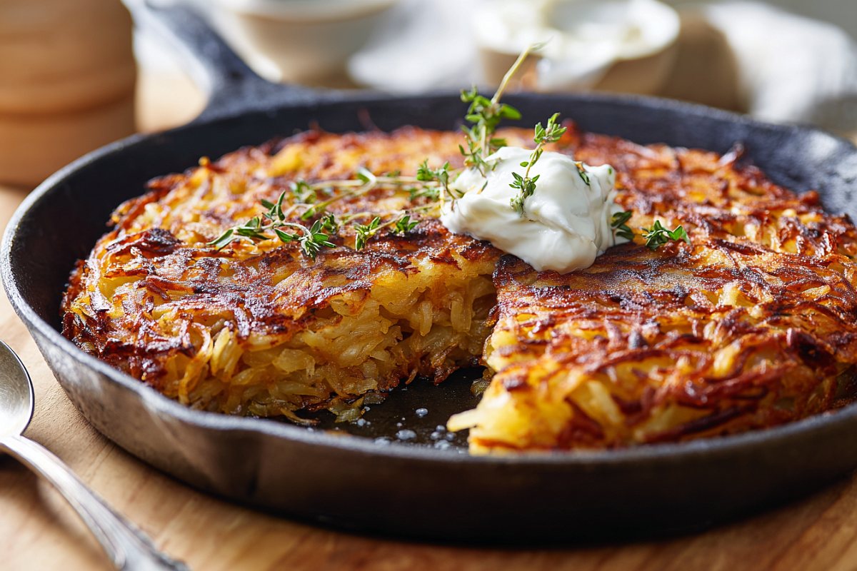 Готовность картофельной лепёшки видно по золотистой корочке и упругой середине. Если нижняя сторона уже подрумянилась, на минуту-полторы усилите огонь — низ станет хрустящим. Подавайте с тёртым сыром, жареными грибами с луком, сметаной, слабосолёной рыбой или хрустящим беконом.