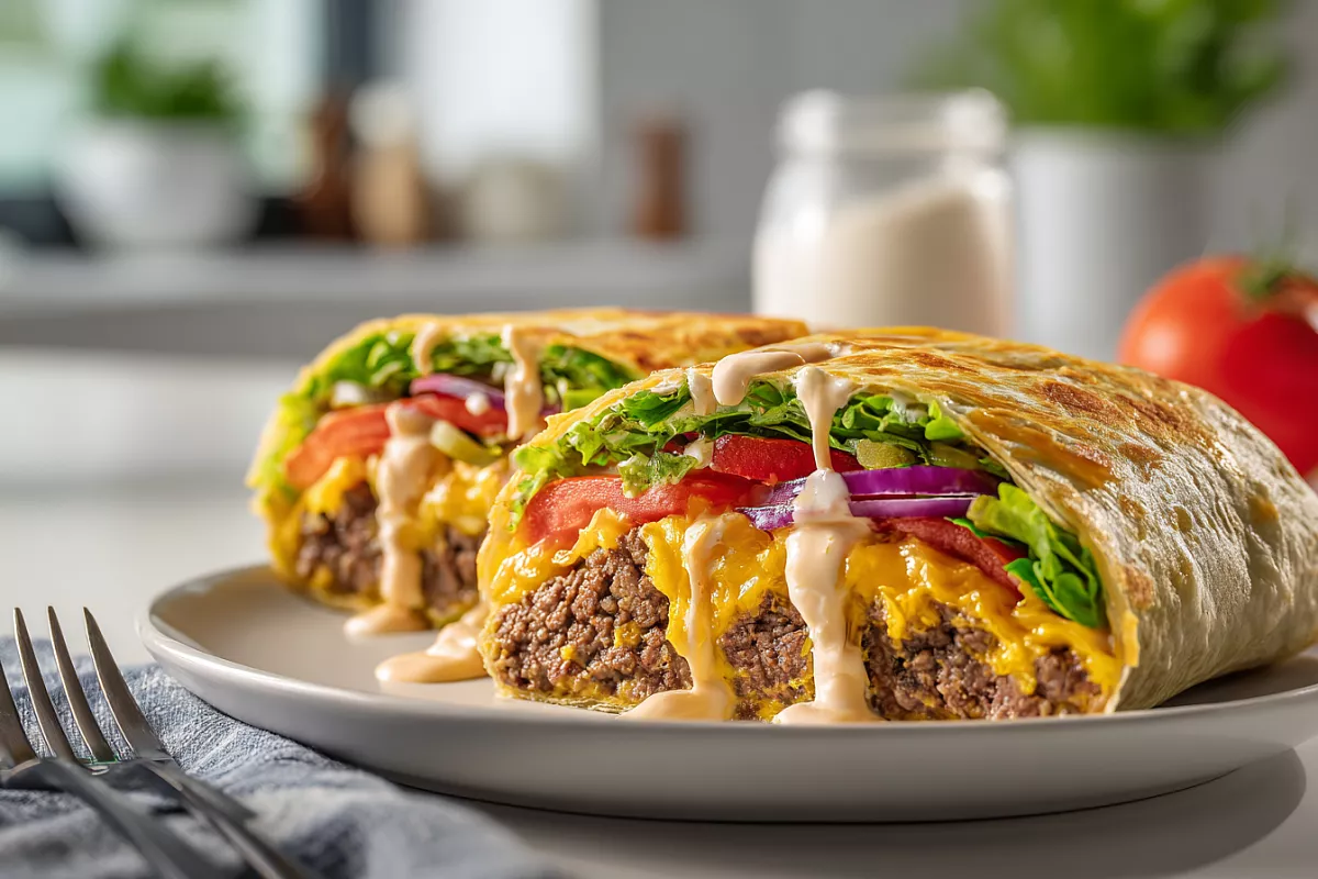 Для сборки берём 2 тортильи (или круглый лаваш). На каждую наносим 1–2 ст. ложки соуса, кладём 2–3 листика салата, котлету, 2 ломтика сыра, ломтики огурца, помидора, лука. По желанию добавляем сверху соус и лист салата. Сворачиваем тортилью, подгибая края. Обжариваем на сухой сковороде по 1–2 минуты с каждой стороны, прижимая, чтобы тортилья стала хрустящей. Подрумяниваем бока.
