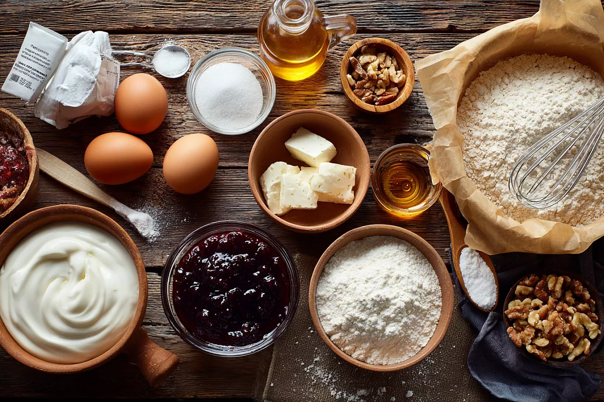 Выдавливаем 150–200 г густого джема (¾ стакана, Дарья использует чёрносмородиновый) небольшими порциями в тесто. Сверху распределяем 150 г сметаны. Посыпаем 2 ст. ложками сахара (по желанию, для вкуса) и 100 г измельчённых орехов (миндаль или грецкие). Выпекаем при 180 °C 45–55 минут. Остужаем полностью. Подаём к чаю, нарезая кусочками.