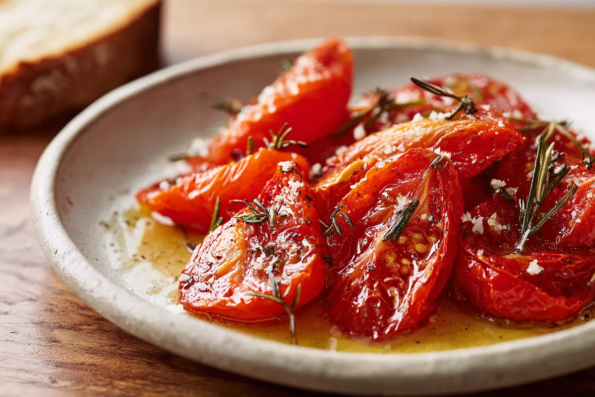 Конфи — мягкая «запеканая» версия: дольки томатов томятся при 100–120 °C с солью, щепоткой сахара, перцем, чесноком и травами (розмарин, тимьян, базилик). Влага уходит, вкус концентрируется, а мякоть остаётся пластичной и сочной. Масло нужно лишь для тонкого покрытия — оно переносит аромат трав в плод и помогает равномерно запекаться.