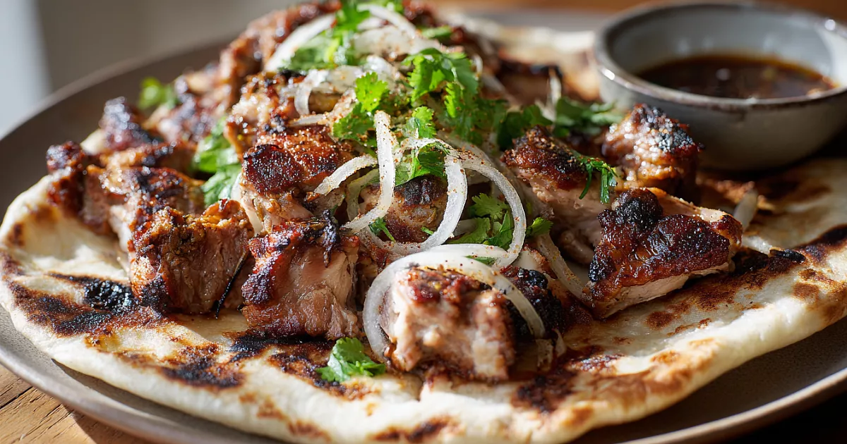 Праздничное мясо без суеты: быстро маринуем свиную шею, запекаем до румянца и подаём на лаваше с луком, зеленью и острым соусом.