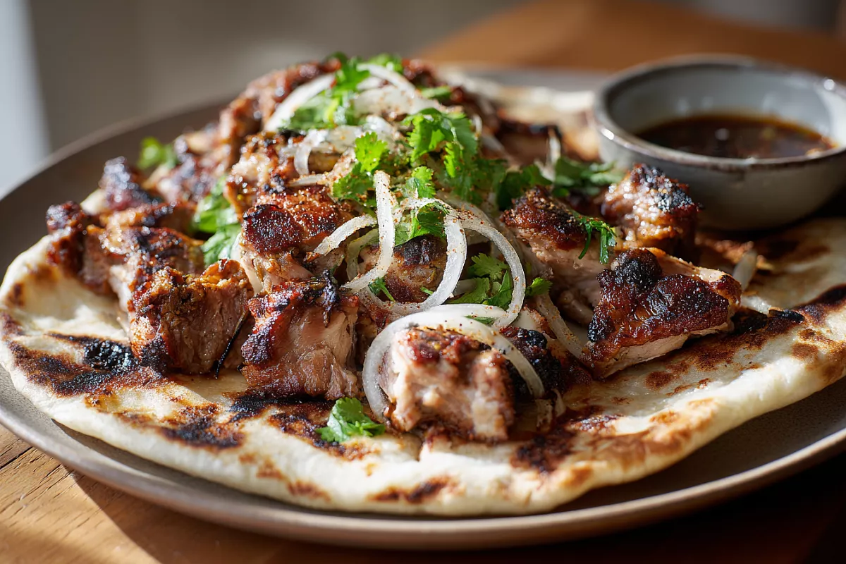 Пока мясо доходит, тонко нарежьте лук полукольцами и подготовьте кинзу (или петрушку). На блюде разверните лаваш, щедро рассыпьте часть лука и зелени. Готовую свинину переложите на «аэродром», сверху снова лук и зелень — аромат раскроется, соки впитаются в лаваш.