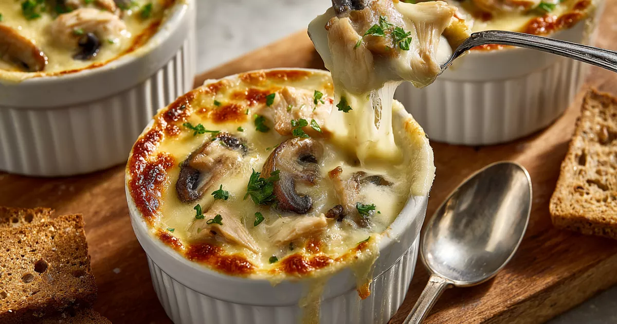 Перемешайте ещё раз, разложите массу по огнеупорным формочкам, щедро посыпьте сыром сверху и отправьте под верхний гриль на 6–8 минут до румяной корочки. Пока запекается, подсушите на сухой сковороде ломтики пшеничного хлеба — будут хрустики к горячей закуске. Подавайте жюльен сразу: тягучий сыр, сливочный соус, сочные кусочки курицы и грибов, а рядом — тёплый хруст хлеба.