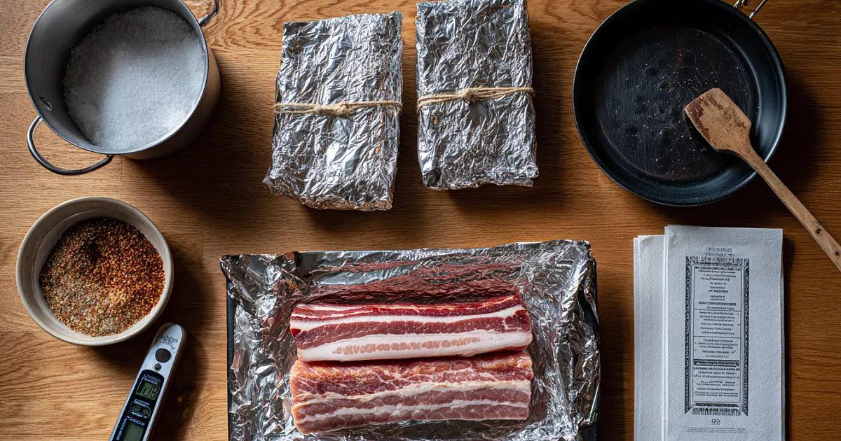 Подготовьте 12 г сухой ольховой щепы: распределите по фольге, накройте вторым листом, загните края в «конверт» и сделайте проколы зубочисткой. Положите конверт на дно толстостенной посуды, установите металлическую подставку и уложите подсушенную грудинку. Разогревайте на самой большой конфорке до появления дыма (обычно через 2–3 минуты), подержите примерно минуту, затем перенесите посуду на самую маленькую конфорку и включите минимальный огонь — дальше идёт мягкое копчение и доведение до готовности. Держите до 65–70 °C в центре куска; после выключения огня не открывайте крышку минимум 30 минут — идёт доготовка.