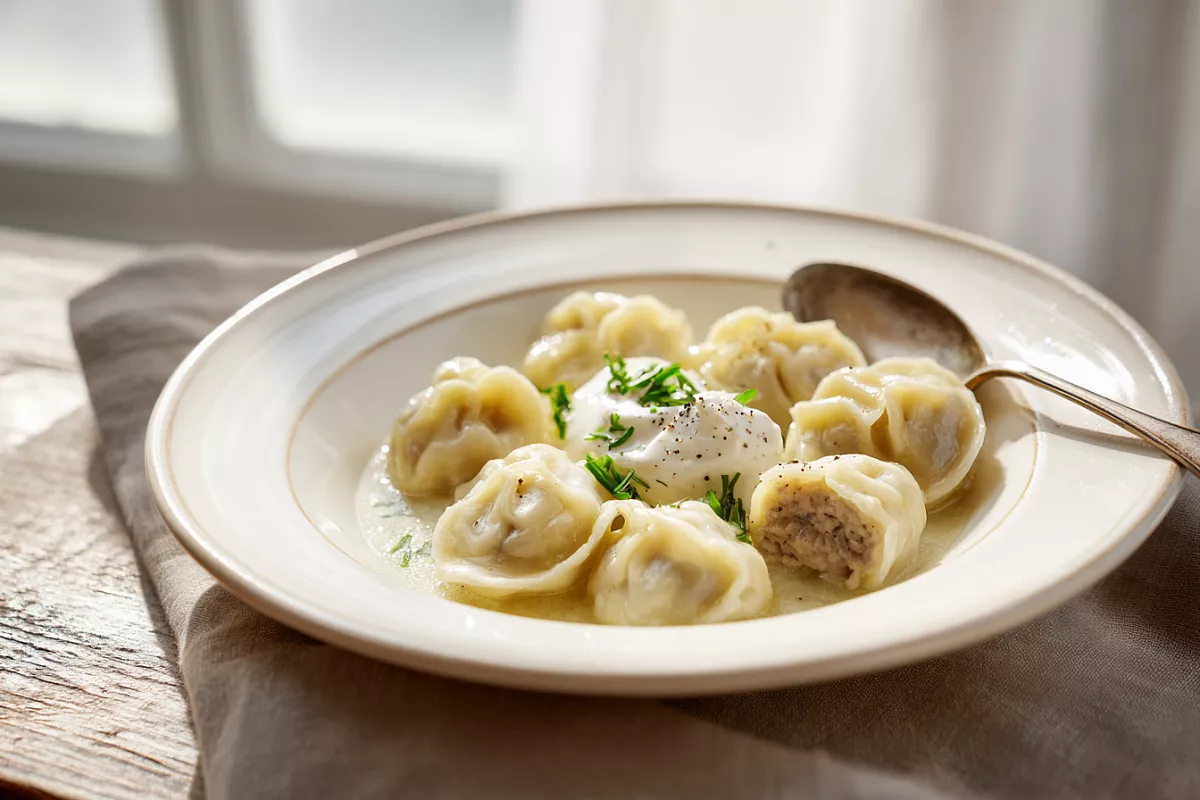 Кипятите подсоленную воду, при желании добавьте пару горошин перца и лавровый лист. Опускайте пельмени партиями. После всплытия варите 5–6 минут до полной готовности фарша. Подавайте со сметаной, маслом или уксусной эмульсией — кому как по душе.