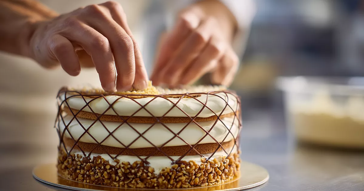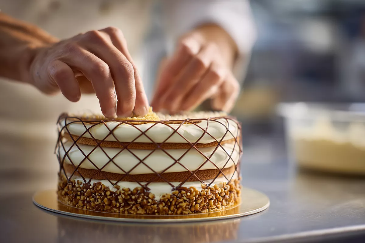 Коржи переверните «низом вверх» — поверхность ровнее. Каждый промажьте тонким слоем крема (примерно по 3 ст. л.), собирая торт. Бока обсыпьте оставленной ореховой крошкой. Сверху отсадите шоколадную решётку или оставьте белым — как в кондитерских тех лет. Дайте десерту постоять 2–3 часа при комнатной температуре для «знакомства» коржей с кремом, затем уберите в холодильник на ночь: структура стабилизируется, ореховый вкус станет глубже.