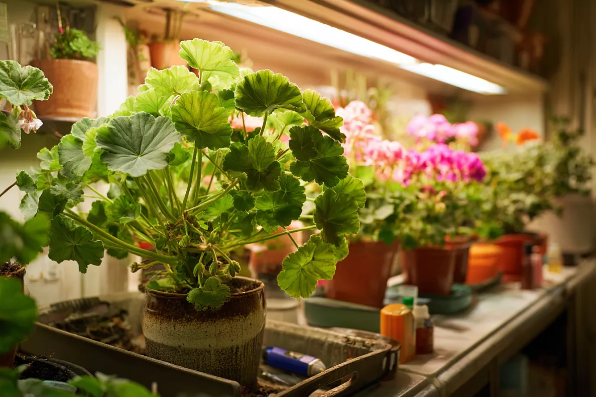 Метод подходит для большого количества гераней, экономит место и время. Храните на поддонах под лампами.