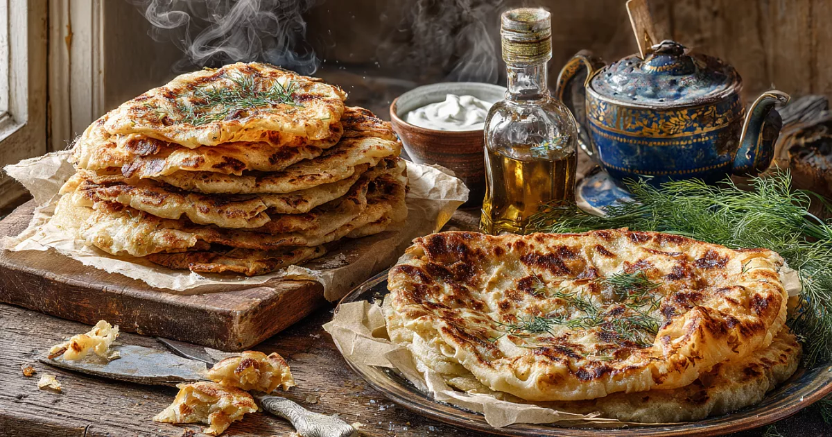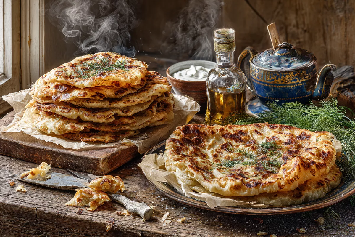 Стол слегка смазывают маслом и не раскатывают, а растягивают тесто руками. Если «устало» и не тянется — накройте плёнкой на 5 минут, потом продолжайте: становится очень послушным и тонким. Смазывают масляно-крахмальной смесью, посыпают тёртым сыром (можно добавить творог) и сворачивают улиткой. Чтобы не порвалось, удобно формировать на пищевой плёнке — так же можно и заморозить впрок. Жарят на сухой сковороде: около 6 минут с одной стороны и 3 минуты — с другой. Аромат топлёного масла и сыра получается особенно аппетитным.