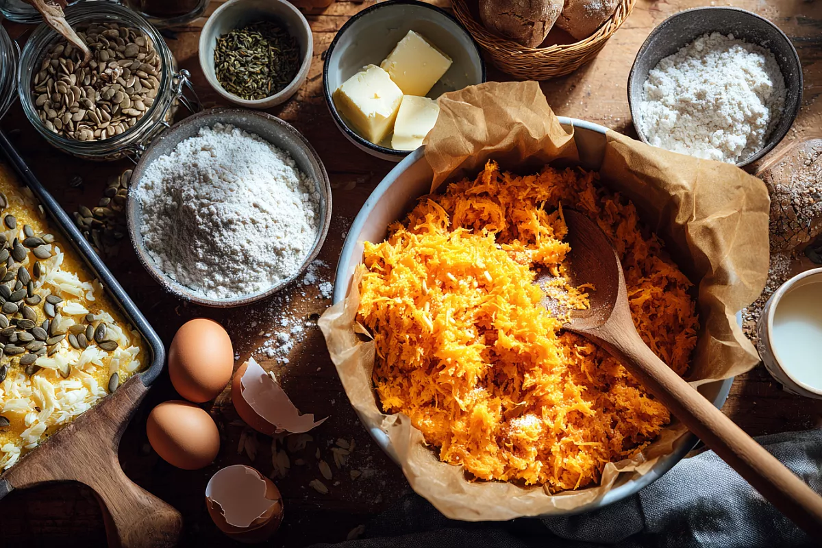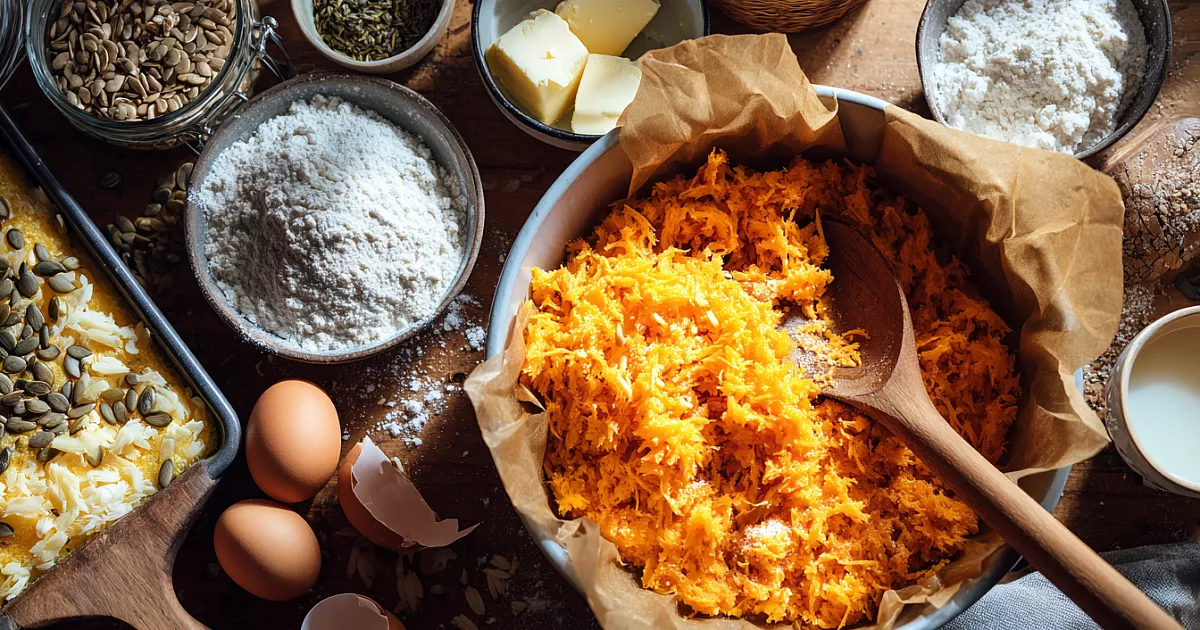 Натираем на крупной тёрке 150 г очищенной тыквы и 100 г твёрдого сыра (например, чеддер). Соединяем в миске, добавляем 3 зубчика чеснока (натёртых на мелкой тёрке), 2 яйца комнатной температуры, 1 ч. ложку овощной приправы (без сахара), 3 ст. ложки жирного греческого йогурта или сметаны, 20 г растопленного сливочного масла. Обжариваем 2 ст. ложки семян подсолнечника и 1 ст. ложку тыквенных семечек на слабом огне, постоянно помешивая, до золотистого цвета, остужаем, добавляем в тесто. Всыпаем 1 ч. ложку разрыхлителя и 4 ст. ложки муки. Перемешиваем, накрываем плёнкой, даём тесту отдохнуть 10–15 минут.