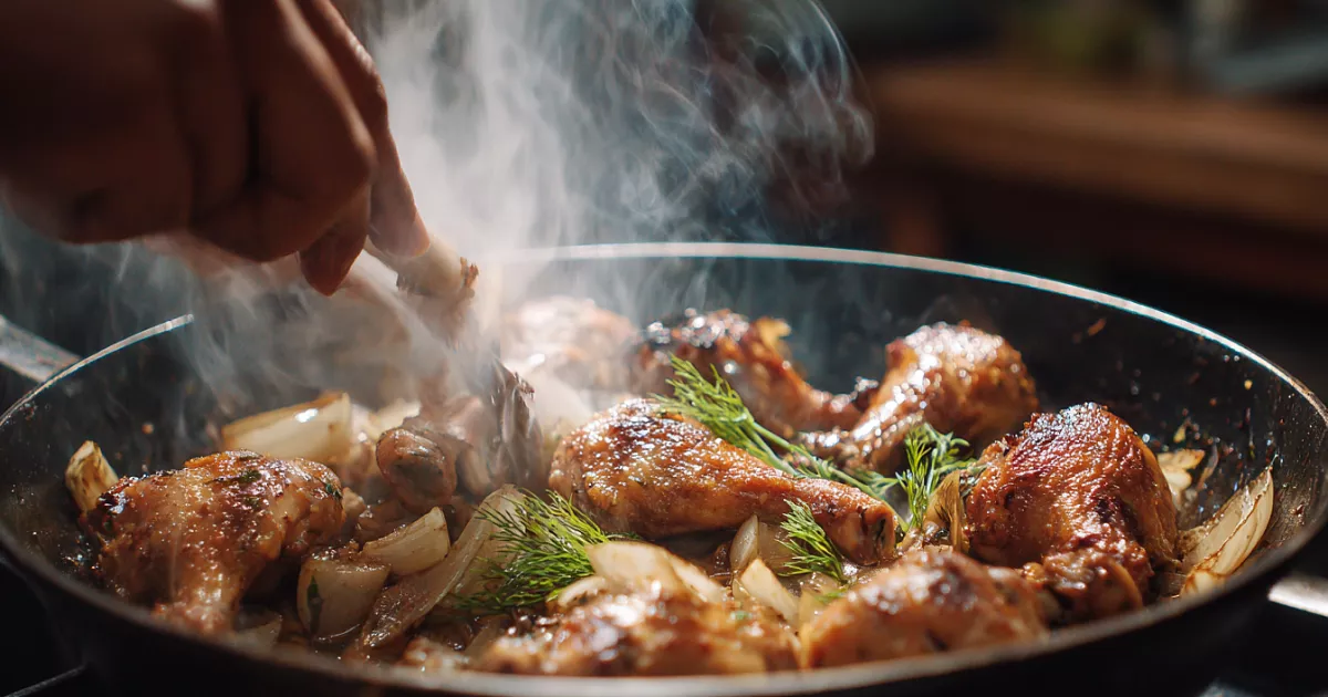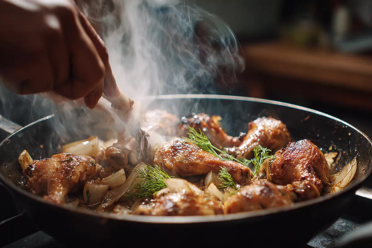 Когда лук станет мягким и почти однородным, выкладываем ножки в сковороду прямо в соус, прикрываем крышкой и томим на умеренном огне 20 минут. Открываем, при желании добавляем 1–2 ст. л. кисло-сладкого соуса чили для пикантности и цвета, снова перемешиваем и готовим ещё 15–20 минут до полной мягкости мяса. За 10 минут до готовности добавляем мелко нарезанный чеснок — аромат станет глубже.