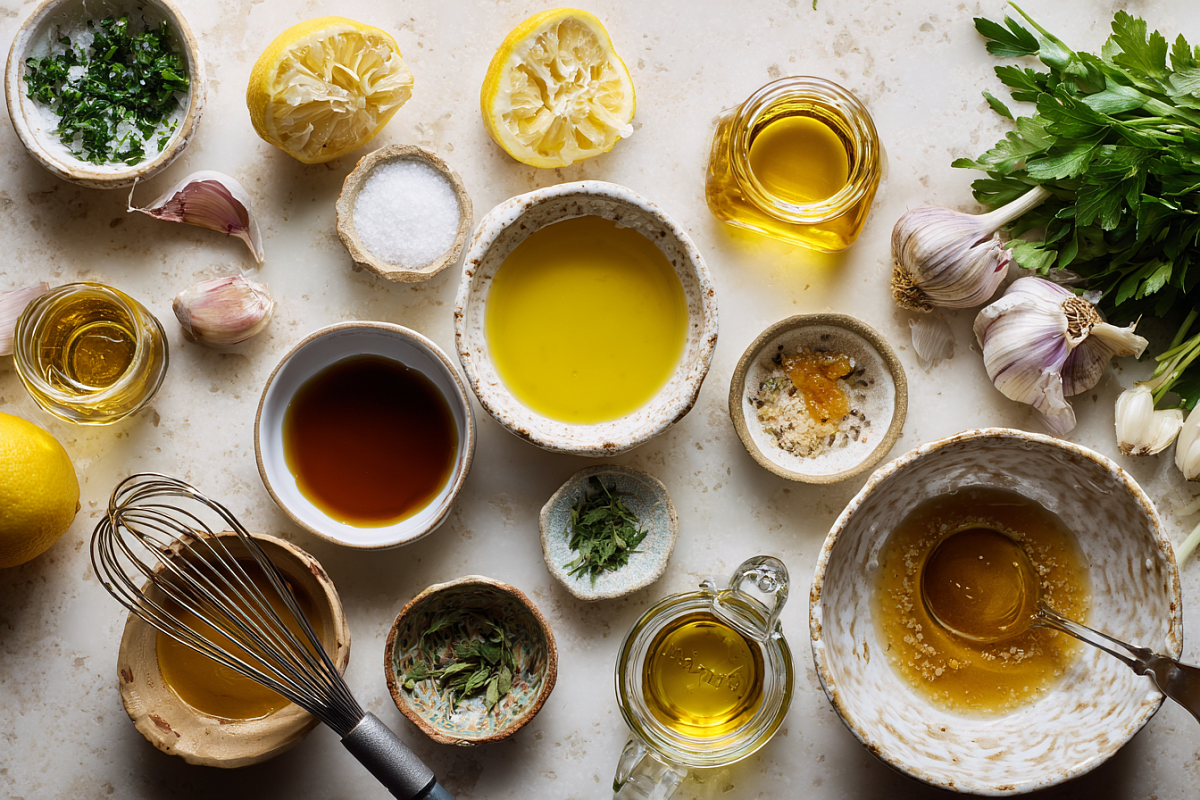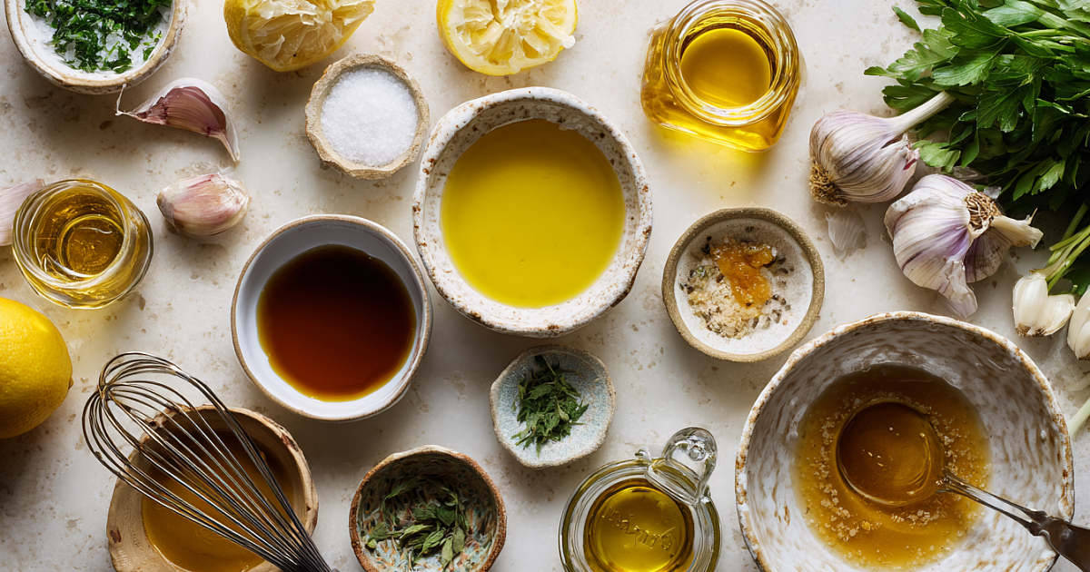 Основа соуса — баланс кислоты и жира: на 1 ст. ложку белого винного уксуса берут 4 ст. ложки масла (3 ст. ложки оливкового и 1 ст. ложку орехового для аромата). Яра добавляет 1 ч. ложку дижонской горчицы для эмульсии, 1 ч. ложку мёда для сладости и ½ ч. ложки соевого соуса для глубины вкуса. Лимонный сок (1 ч. ложка) и цедра (½ ч. ложки) усиливают свежесть, а для пикантности — мелко натёртые шалот (1 ч. ложка) и чеснок (½ ч. ложки). Все ингредиенты, кроме масла, взбивают венчиком до однородности, затем постепенно вводят масло, чтобы получилась кремовая эмульсия.