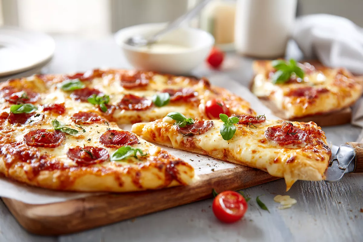 Пиццу выпекают в разогретой до 190 °C духовке 15–17 минут. Готовую пиццу нарезают на кусочки, пока она горячая, и подают к столу. Ведущий подчёркивает: «Результат — аппетитная, ароматная пицца, которая готовится молниеносно!» Этот рецепт идеален для тех, кто хочет быстро порадовать семью вкусным ужином без лишних усилий. Простота и доступность ингредиентов делают его хитом для домашнего меню.