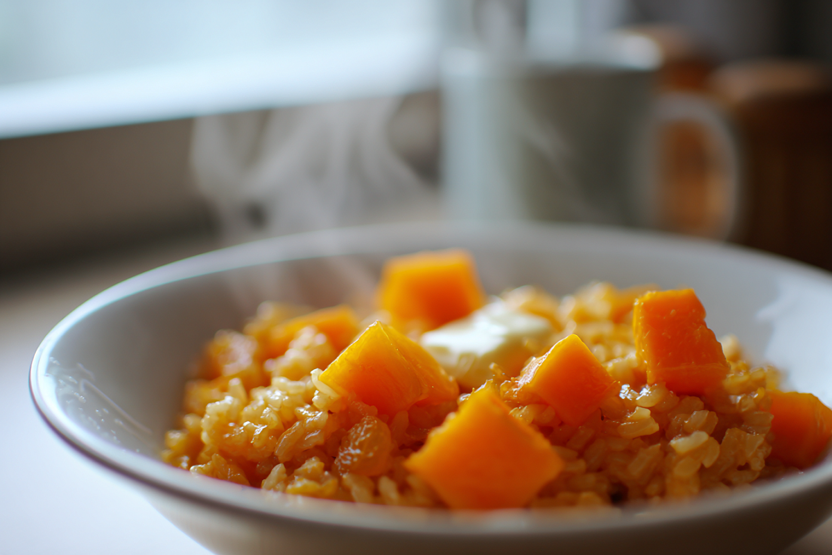 Через 20 минут получается бархатная каша: тыква держит форму, но тает от ложки, изюм — сочный, как будто только что сорванный с кисти. Рис мягкий, но не разваренный в клей.