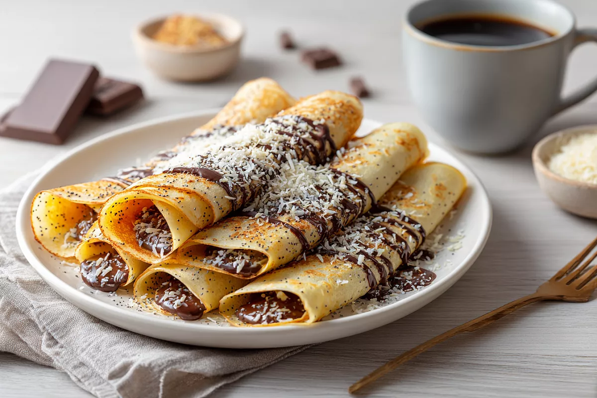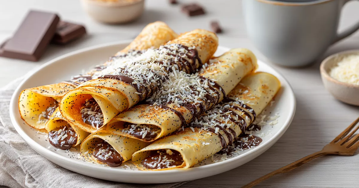 Десертные блинчики с кокосовой стружкой, шоколадом или маком — идеальное угощение для детей и взрослых. Маруся уверяет: «Эти блины простые, быстрые и невероятно вкусные!» Для теста понадобятся мука, молоко, вода, яйца, сахар, соль и ванильный сахар, а для начинки — шоколад, кокосовая стружка и мак.