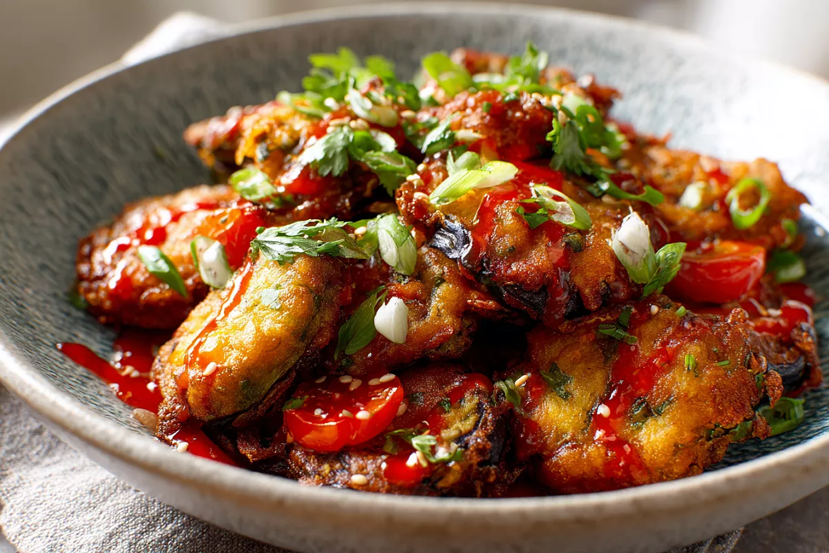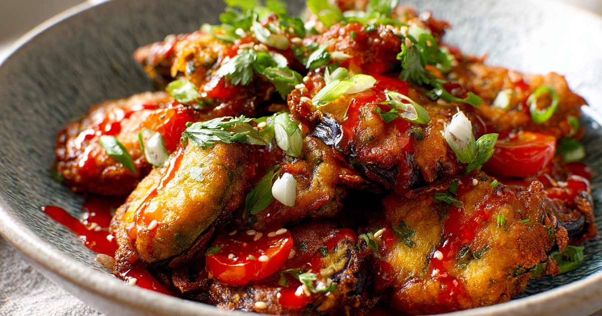 Салат с характером: золотистые баклажаны, свежие помидоры, травы и соус sweet chili — хруст снаружи, сочность внутри.