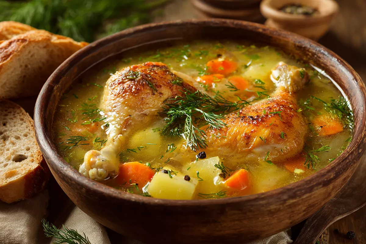 В кастрюле на 3 л варят бульон из 4 куриных голеней в 3 л воды. После закипания первую воду сливают, мясо промывают, заливают свежей водой и варят с 3–4 лавровыми листами и 5 горошинами душистого перца до готовности, процеживая бульон. Горох (250 г, лучше колотый) промывают 3–4 раза, заливают 700–1000 мл воды, кипятят, сливают первую воду, снова заливают и варят до размягчения (20–30 минут). Картофель (4–5 шт.) нарезают кубиками, лук (1 шт.) — мелко, морковь (1 шт.) — кубиками 0,5×0,5 см.