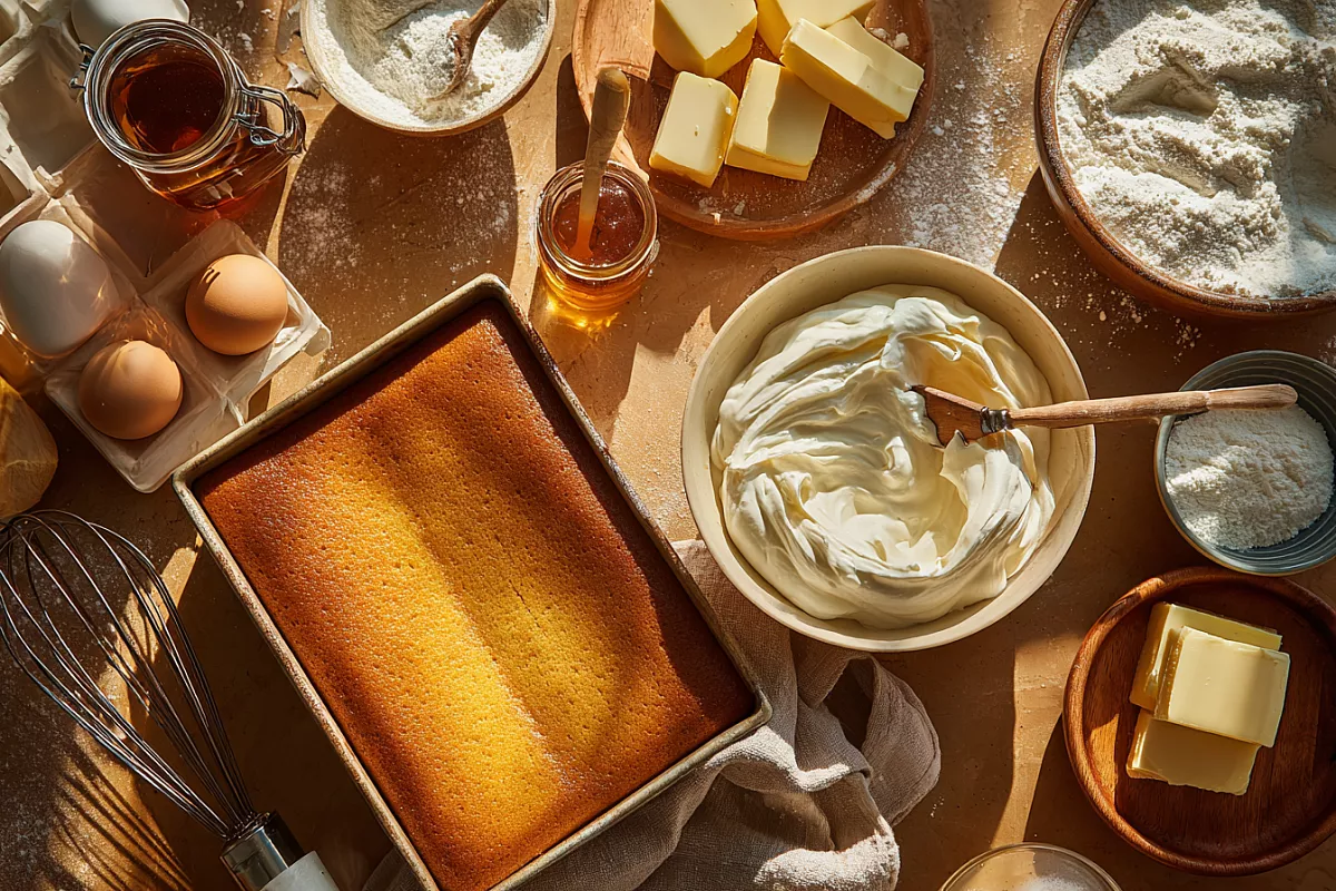 В глубоком сотейнике на небольшом огне растапливают 120 г мёда, 100 г сливочного масла и ¼ ч. ложки соли, помешивая венчиком до однородности. В 120 г сметаны (15%) добавляют 1,5 ч. ложки соды, чтобы она погасилась, и вводят в медовую смесь. Уваривают до карамельного оттенка, масса сильно пенится, поэтому нужна глубокая посуда. Смесь слегка остужают. В миске взбивают 3 яйца (С1) с 60 г сахара до пышной белой массы (6–7 минут). Тонкой струёй вливают тёплую медовую смесь, перемешивая на низкой скорости. Добавляют 220–260 г просеянной муки, замешивая тесто до консистенции растопленного шоколада.