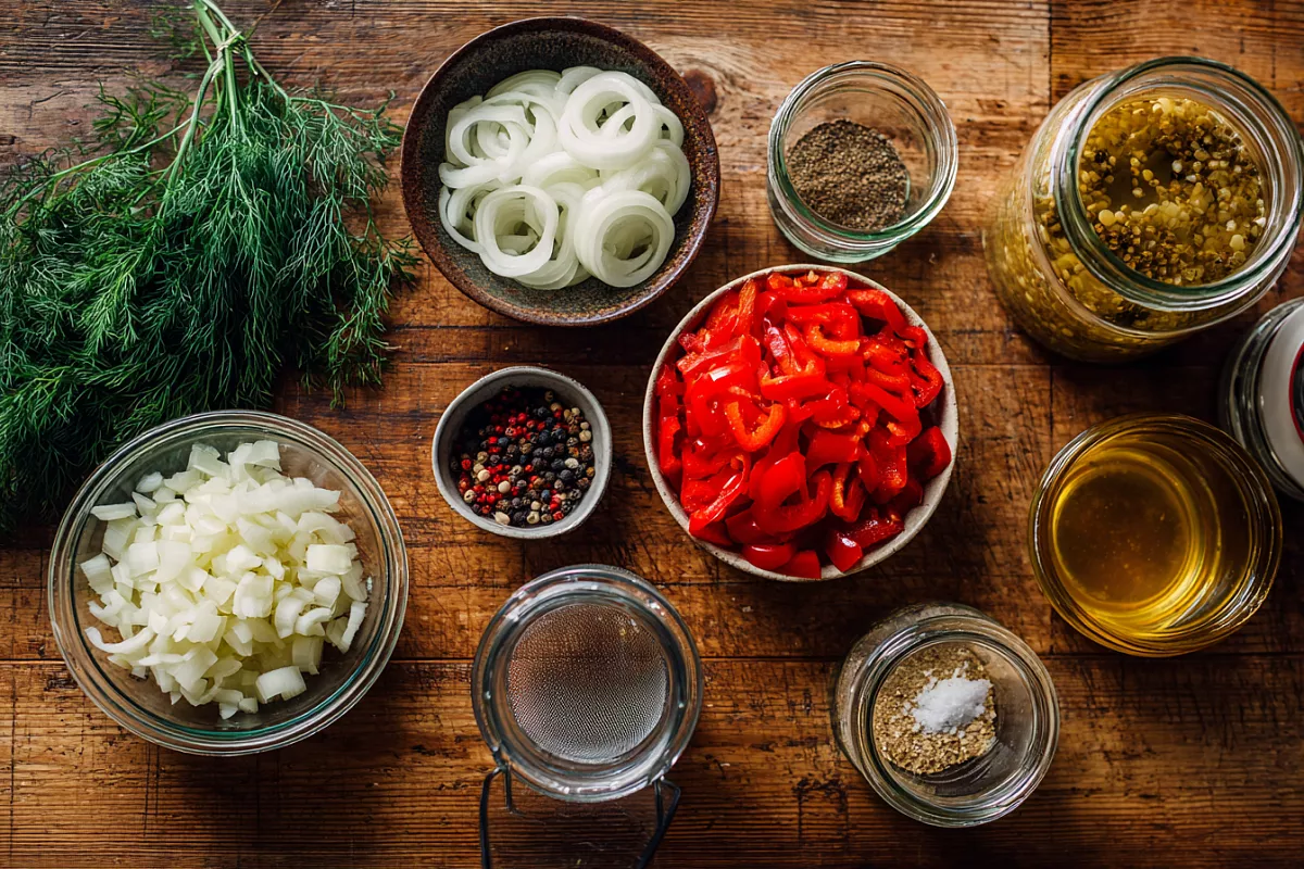 Лук режьте полукольцами средней толщины — около 0,5 см: тончайший «растворится» во вкусе маринада, слишком крупный не успеет пропитаться. Чеснок нарежьте пластинами, сладкий перец — четвертинками, а затем полосками примерно по 1 см. По желанию добавьте немного острого перца — чтобы придать пикантность, но не «огнедышать». Зелень укропа закладывайте щедро, вместе с мягкими стеблями.