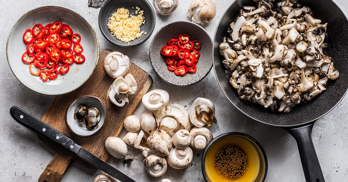 Грибы лучше брать культивированные — шампиньоны и вёшенки безопасны и доступны. Шампиньоны разрежьте на четвертинки, вёшенки оставьте небольшими пучками для красивой фактуры. Лук тонко нашинкуйте и быстро обжарьте в сковороде до мягкости — лёгкая сладость лука важна для вкуса этой закуски.