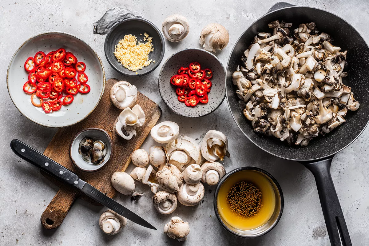 Отдельно сильно разогрейте растительное масло (около 70 мл) до лёгкого дымка. Пока масло греется, мелко нарежьте 4–5 зубчиков чеснока и подготовьте острый чили и паприку. В миске с грибами сделайте небольшую «воронку»: на дно — щепоть чили, сверху — чеснок, по краям — жареный кунжут. Залейте всё раскалённым маслом — специи мгновенно раскроются и аромат мягко пропитает грибы.
