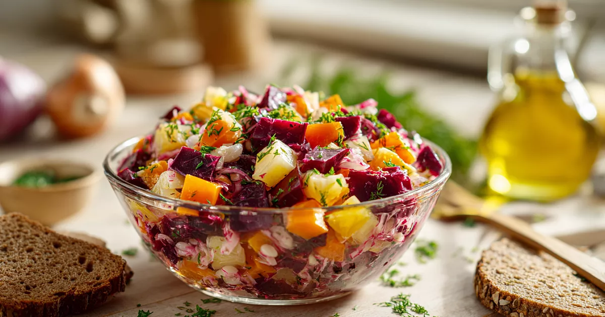 Этот винегрет — яркий, аппетитный и традиционный салат, который идеально подходит для семейного обеда. Валерия уверяет: «Он красочный, вкусный и хранится пару дней!» Для салата нужны квашеная капуста, солёные огурцы, варёные овощи, фасоль, лук и растительное масло.