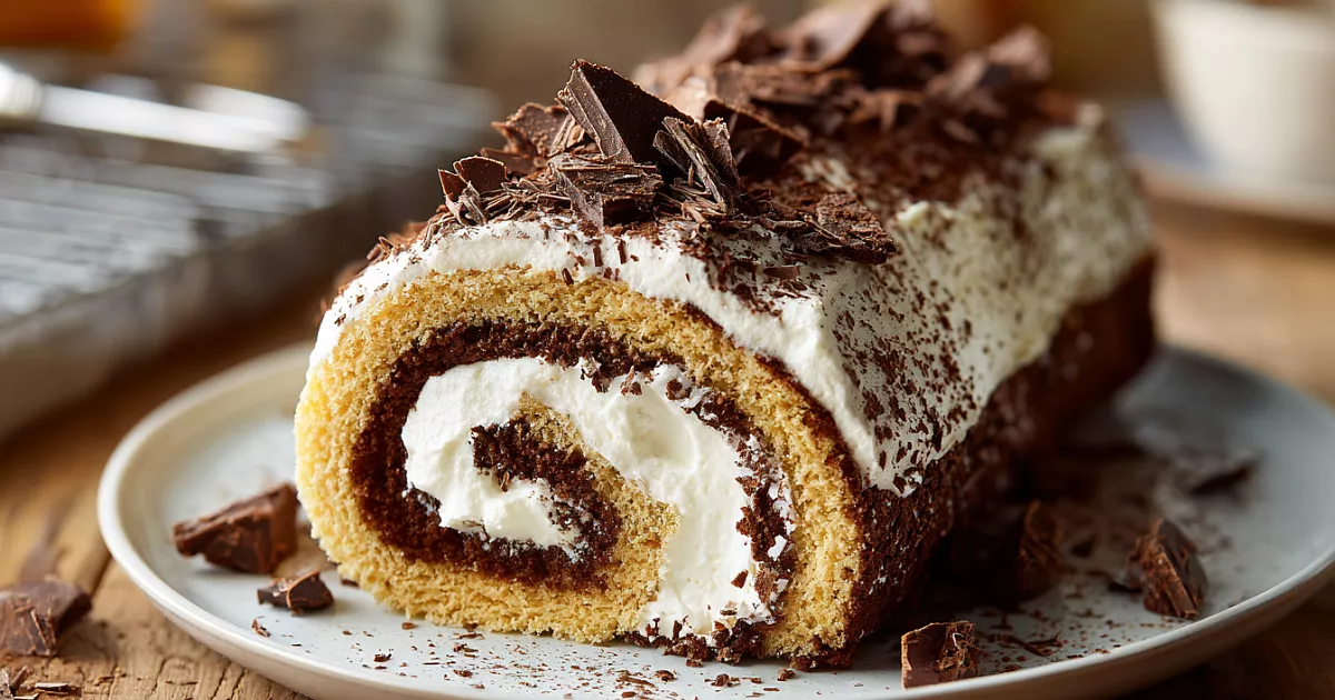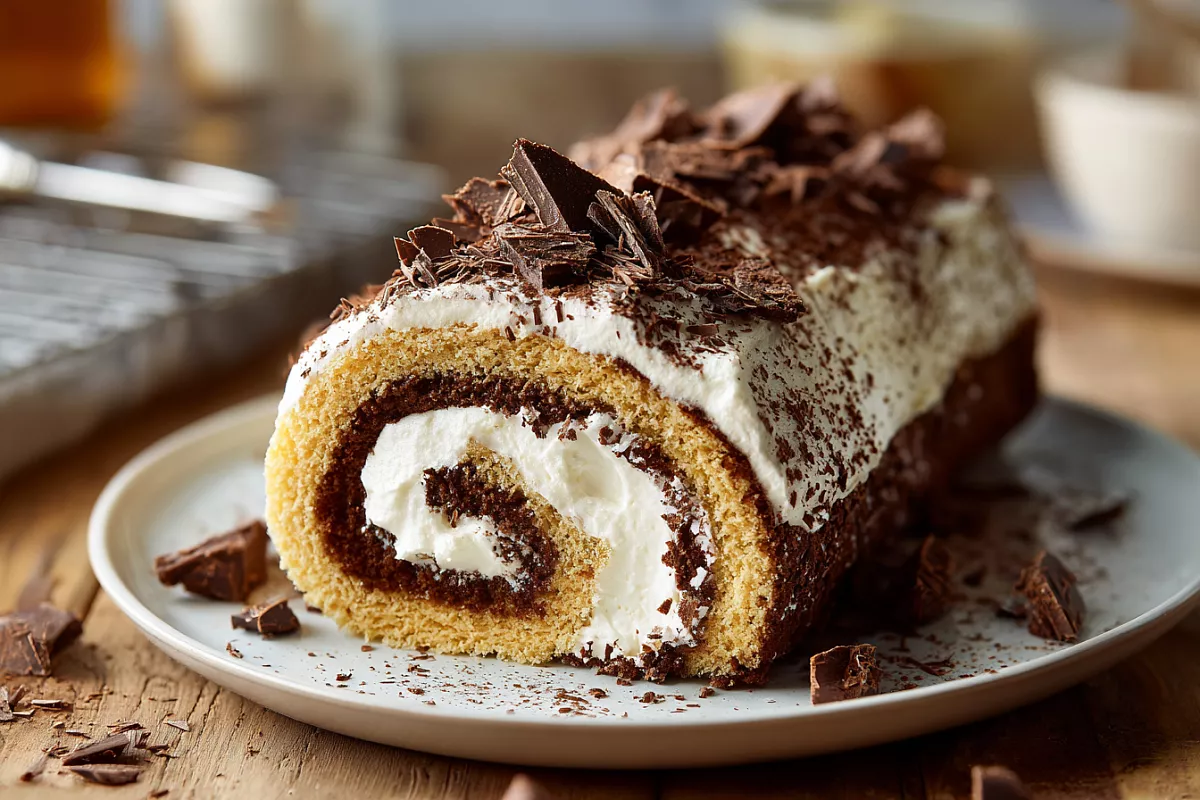 Нежный и воздушный рулет: мягкий бисквит с кофейной пропиткой, крем на маскарпоне и шоколадная крошка для выразительного акцента.