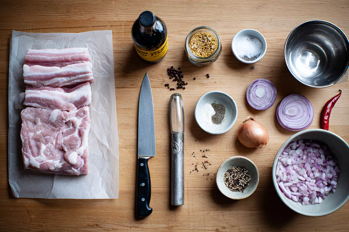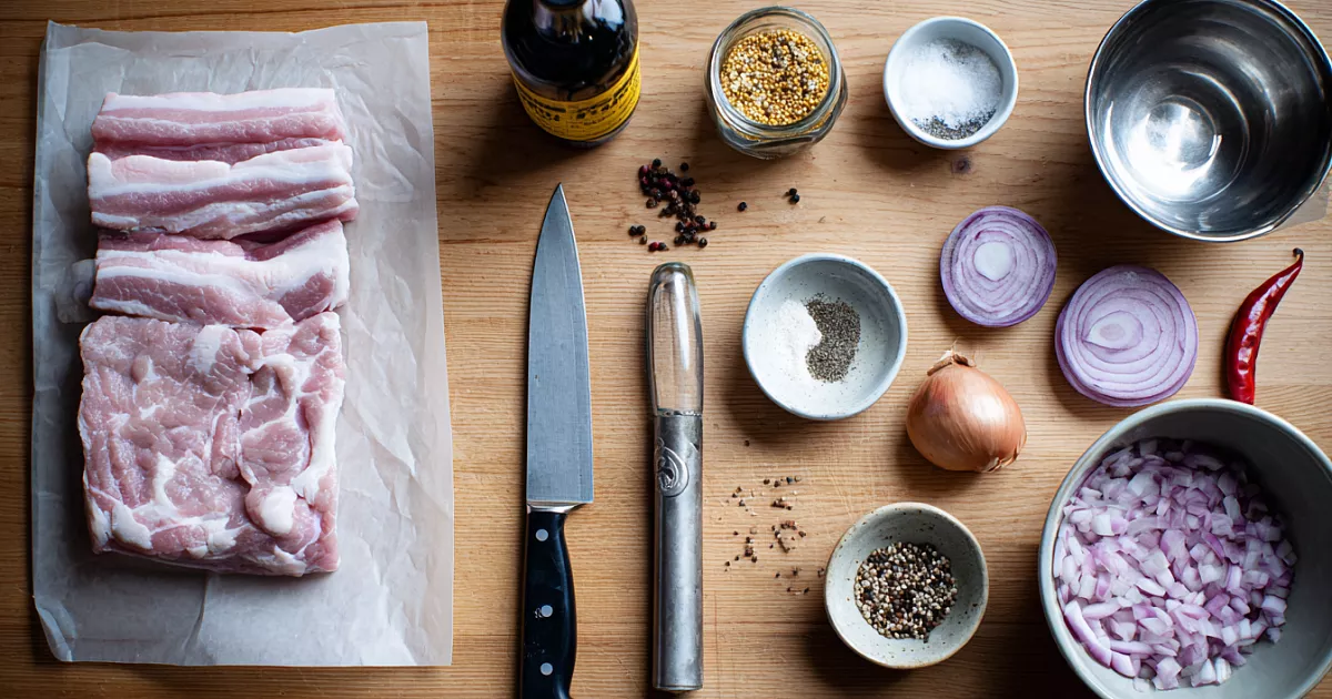 Сырой шпик без засолки: тонкие ломтики в луково-уксусном маринаде с чесноком, горчицей и перцем. Через 2 часа — мягкая, «шашлычная» по ноте закуска.