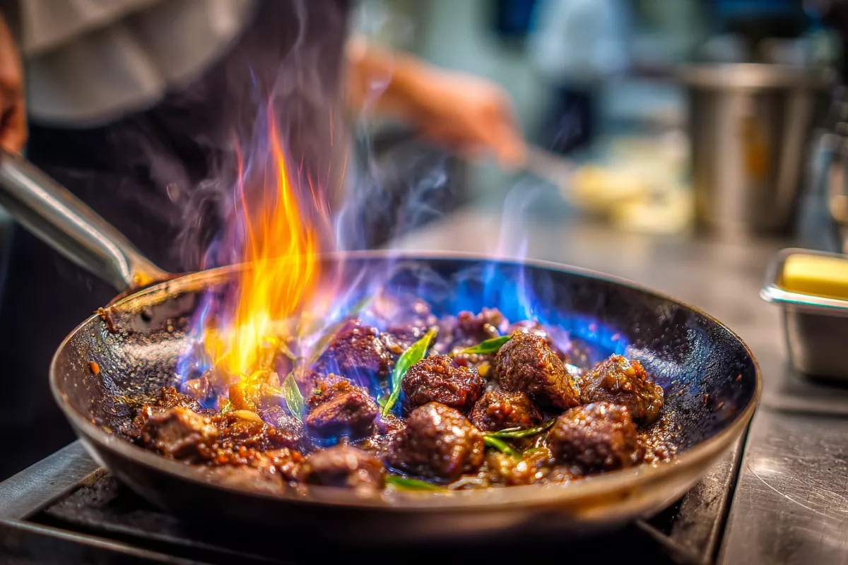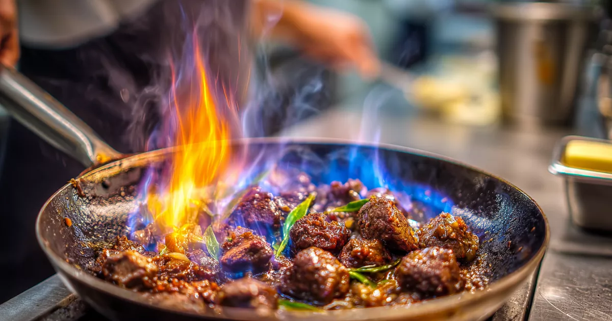 Усилите огонь и быстро обжарьте печень. Алкоголь (бурбон, коньяк или бренди) подогрейте и аккуратно подожгите — фламбе поможет выпарить спирт и оставить только тёплые оттенки. Затем огонь уменьшите, вмешайте остаток масла, посолите, добавьте специи и доведите до готовности.
