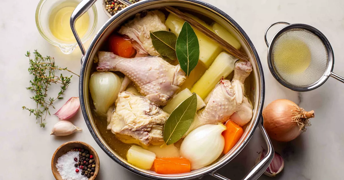Кладу половинку луковицы неочищенной, пару лавровых листьев, горошины душистого и цветного перца. Можно добавить морковь и черешковый сельдерей. Дальше только томление: очень тихий огонь 2,5 часа, почти без кипения, чтобы бульон не помутнел.