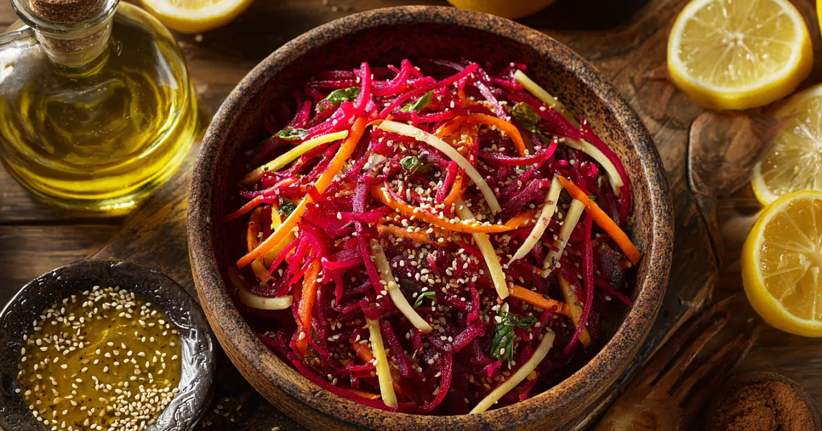 Этот салат готовится за считаные минуты и не требует сложных навыков. Сочетание хрустящей моркови, сочного яблока и сладковатой свёклы с ароматным кунжутом делает блюдо ярким и аппетитным. Оно подойдёт как для лёгкого перекуса, так и для дополнения к основному блюду.