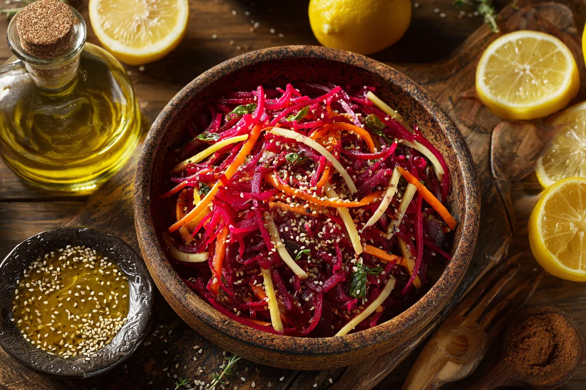Морковь и свёклу очищают, яблоко разрезают, удаляют семена, оставляя кожуру с полезными веществами. Морковь и яблоко натирают на крупной тёрке, свёклу — на мелкой для нежной текстуры. Для соуса выжимают сок из половины лимона, смешивают с мёдом и оливковым маслом, регулируя пропорции по вкусу. Кунжут слегка обжаривают на сухой сковороде до золотистого оттенка, чтобы раскрыть аромат. Все ингредиенты соединяют в миске, добавляют соус и кунжут, тщательно перемешивают. Наталья советует: «Пробуйте соус и добавляйте мёд или лимон по своему вкусу!» Количество соуса можно варьировать, чтобы добиться идеального баланса кислоты и сладости.