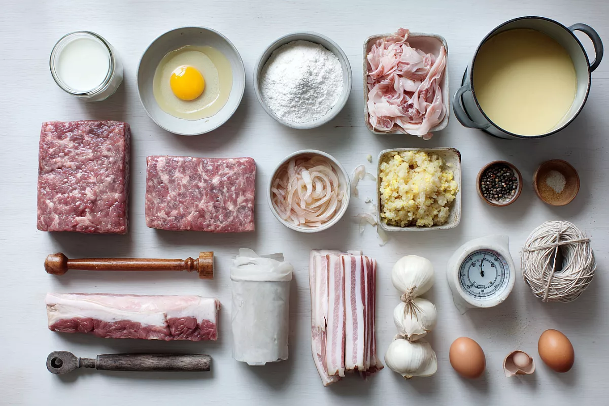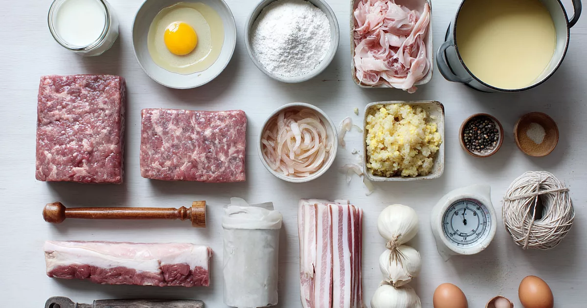 Печень свиная очищена от плёнок и протоков и вымочена 2–3 часа в холодной воде — это убирает лишнюю кровь и горечь. Нежирную свинину (корейка, карбонат) и грудинку/щековину берут в оговорённых долях. Яйцо, молоко, лук, мука, соль, белый перец подготовьте заранее, свиную череву промойте и замочите в тёплой воде.