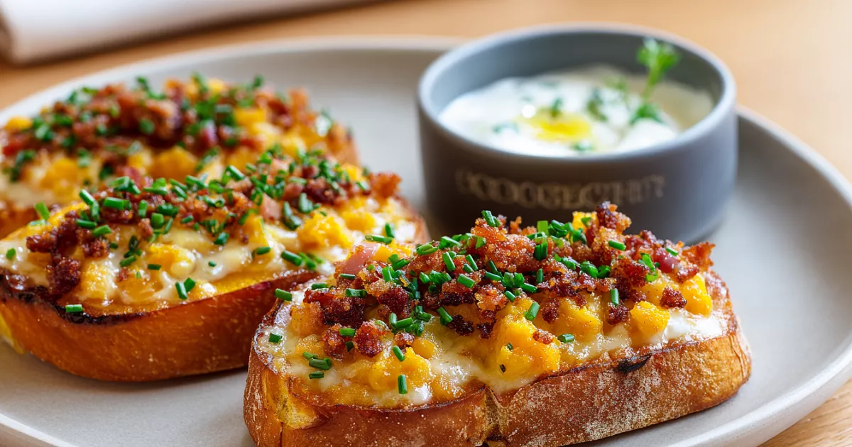Такие тёплые «тосты» удобны для быстрого ужина или бранча. Менять акценты просто: козий сыр с мёдом, слабосолёный лосось со сливочным сыром, или вовсе без мяса — с тонко обжаренными грибами и поджаренными лесными орехами. Подайте с хрустящим салатом или ложкой греческого йогурта с каплей лимонного сока — контраст текстур и вкуса делает блюдо особенно уютным.
