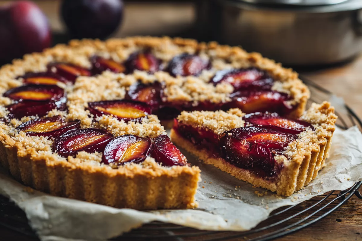 Не пересушивайте карамель — держите огонь умеренным и чаще помешивайте. Крошку делайте именно рассыпчатой: добавьте щепотку муки к отложенному тесту и перетрите — так верх получится румяным и хрустящим. Начинку легко варьировать: абрикосы, персики или мягкие груши подойдут не хуже слив.