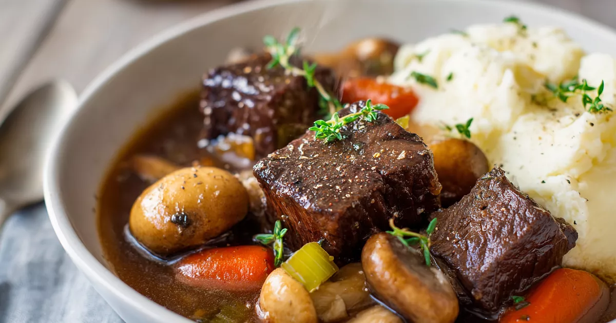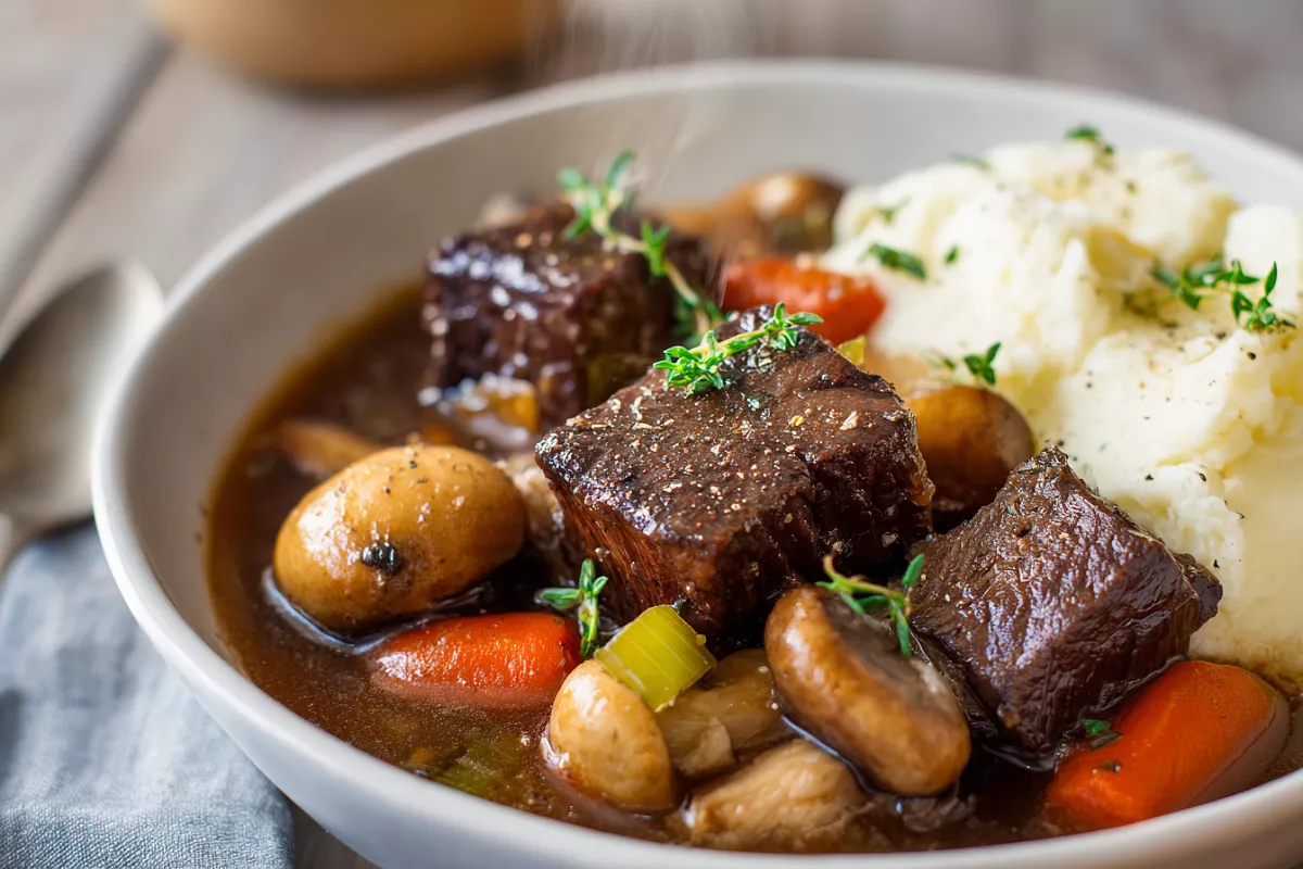 Когда говядина почти мягкая, добавьте лавровый лист, душистый перец, тимьян и чёрный перец. Посолите по вкусу. Потомите ещё 15–20 минут до полной мягкости и блеска соуса. Подавайте горячим с картофельным пюре — овощи тают во рту, мясо аккуратно распадается, соус густой и ароматный.