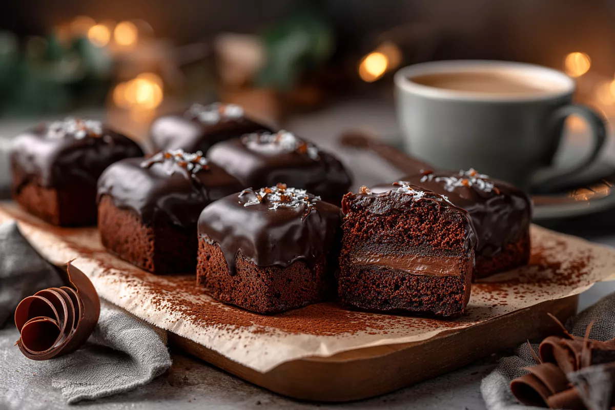 Для глазури растапливают 200 г тёмного шоколада с 200 г масла на водяной бане, заливают пирожные, разравнивают и охлаждают 30 минут. Пирожные нарезают, погружая только кончик ножа, чтобы избежать трещин. Украшают кремом через насадку или посыпают орехами.