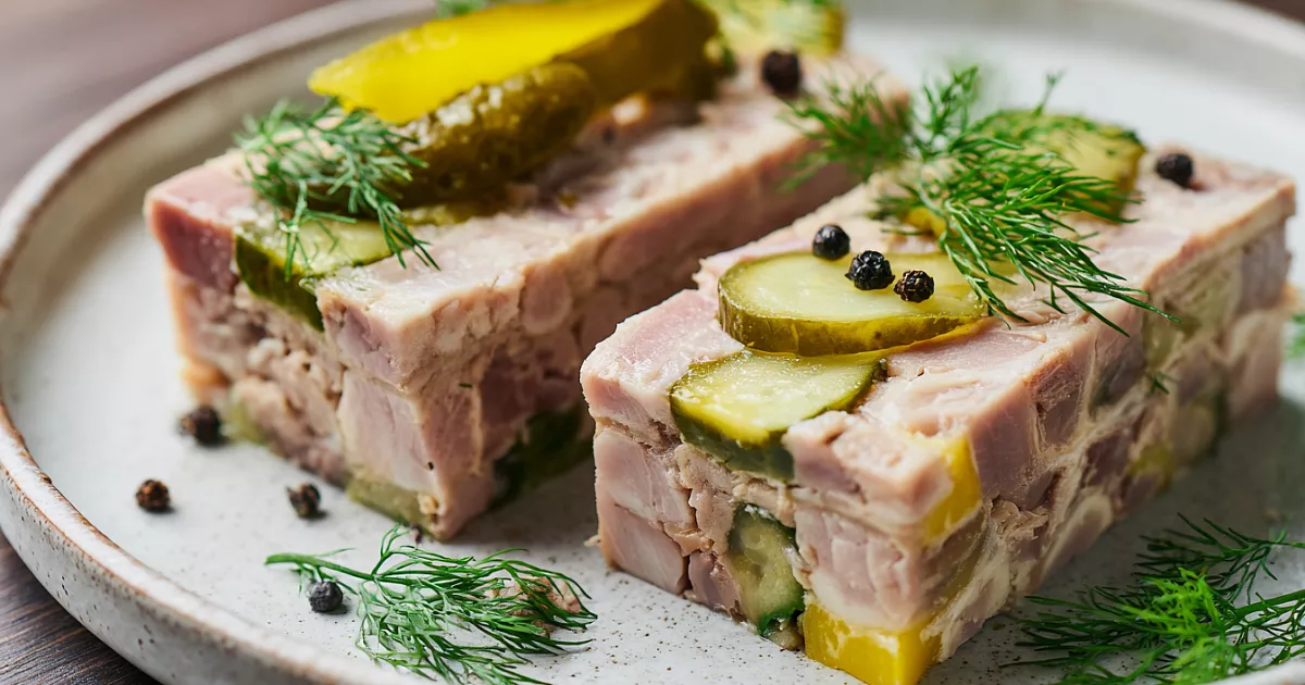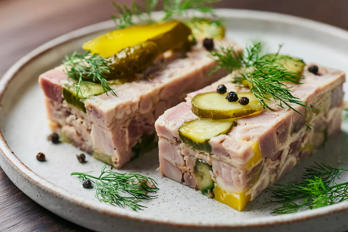 Готовый сальтисон выньте из формы, снимите плёнку, нарежьте и подавайте. Хорош и сам по себе, и в ассорти закусок. Не спешите: полное охлаждение под гнётом делает срез ровным, а текстуру — упругой. Если любите более пряный акцент, часть горошка перца можно слегка растолочь и вмешать в тёплое мясо перед сборкой.