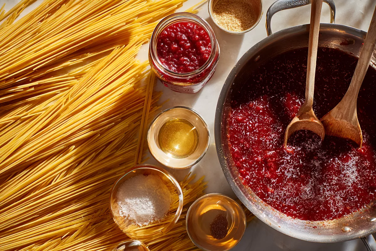 На масле слегка подрумяньте мелко рубленый чеснок с хлопьями острого перца. Влейте томатный соус, посолите и уварите до лёгкого шипения по краям. Разровняйте в сковороде сухие спагетти и подлейте порцию томатного бульона (вода + томатная паста + щепотка сахара). Дайте впитаться и снова шипеть — и повторите добавление ещё несколько раз, переворачивая пасту тонкими лопатками, как деликатную рыбку.