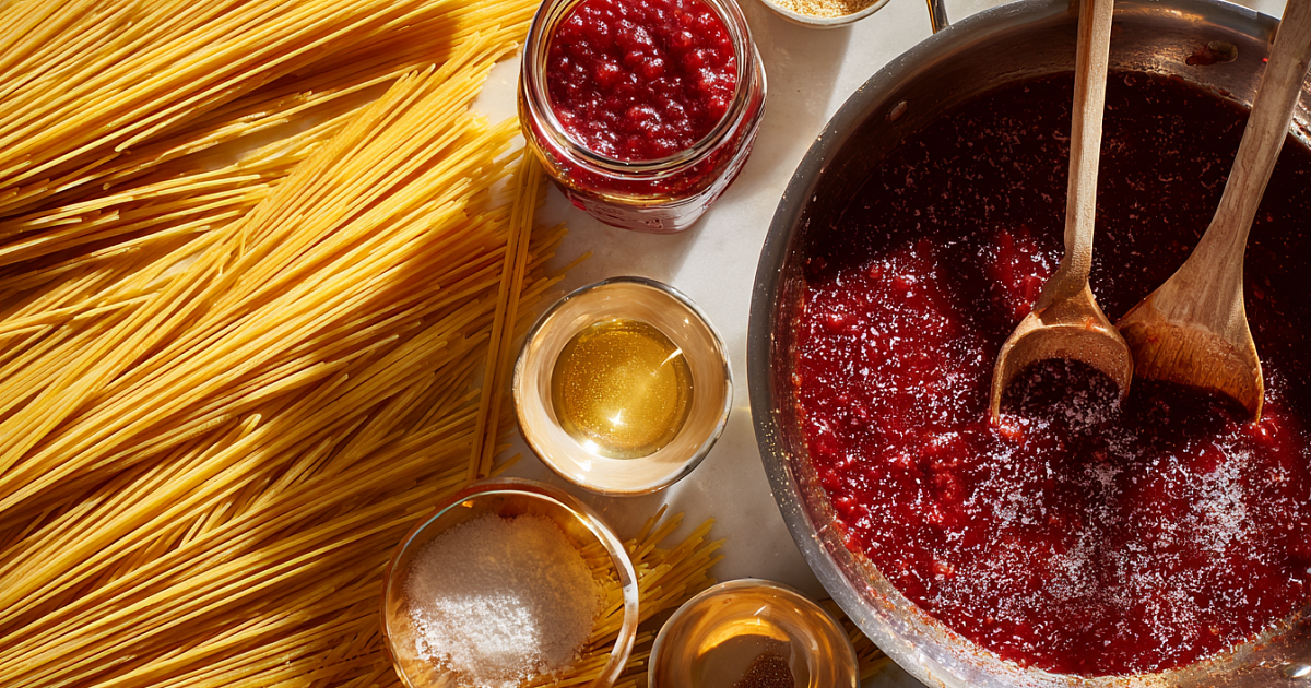Родом из Бари (Италия), эта паста ломает привычные «итальянские правила». Спагетти не варят в кастрюле, а готовят прямо на сковороде в остром томатном соусе, понемногу подливая томатный бульон. В итоге соус упаривается, нити пропитываются и местами подрумяниваются до благородной горчинки.