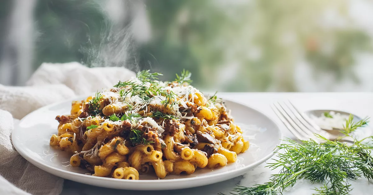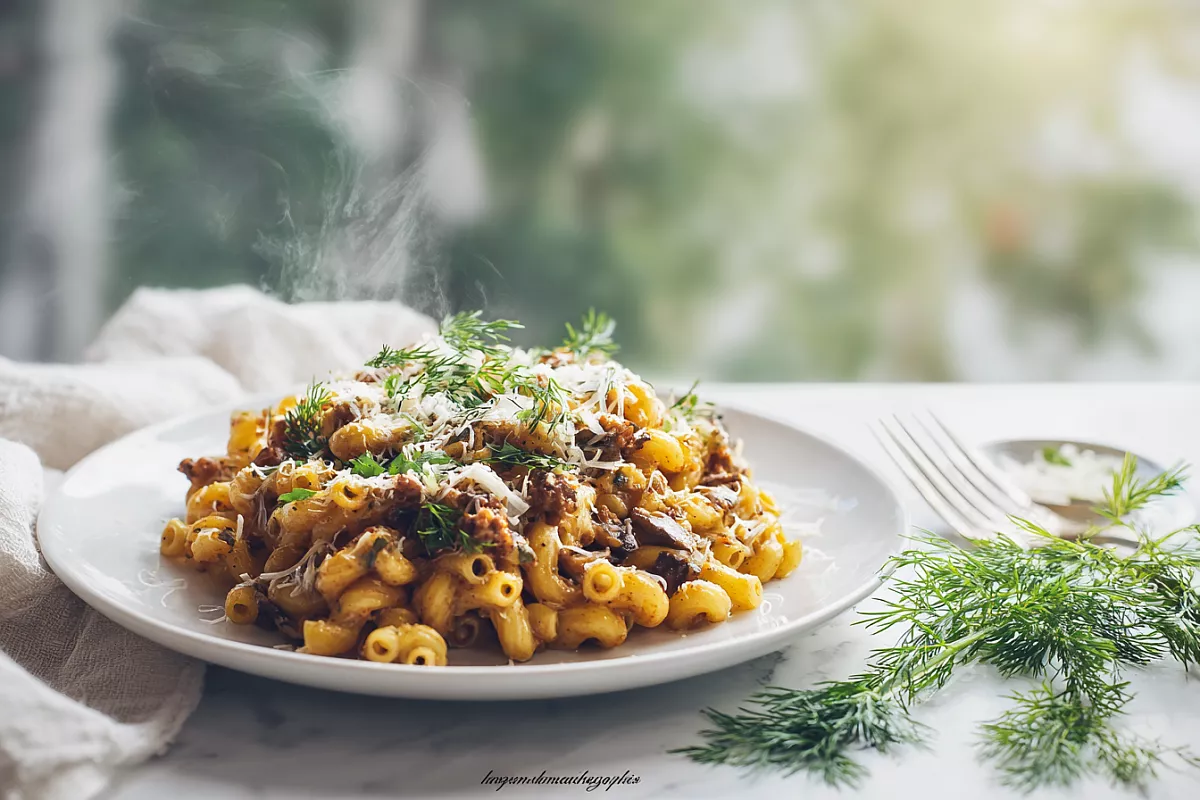 Для блюда берут макароны (на 2–4 порции), 300 г отварной говядины, 200 г шампиньонов, одну крупную луковицу, пучок укропа или петрушки, 50 г сливочного масла, 30 мл растительного масла, соль, перец и тёртый сыр для подачи.
