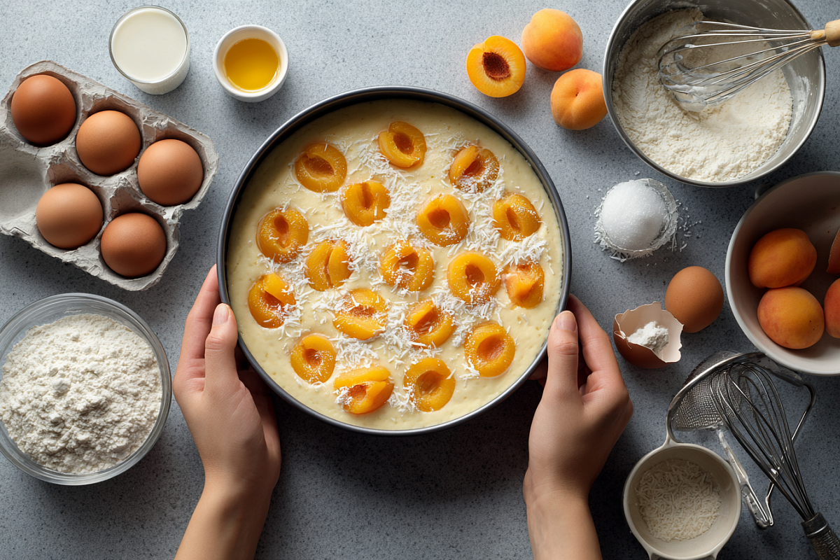 Переложите тесто в форму и разровняйте. Сверху уложите кусочки консервированных фруктов, слегка утапливая. При желании присыпьте кокосовой стружкой или рублеными орехами. Выпекайте до сухой шпажки примерно 35 минут. Ориентируйтесь на свою духовку: верх должен подрумяниться, а центр подпружинивать при лёгком нажатии.