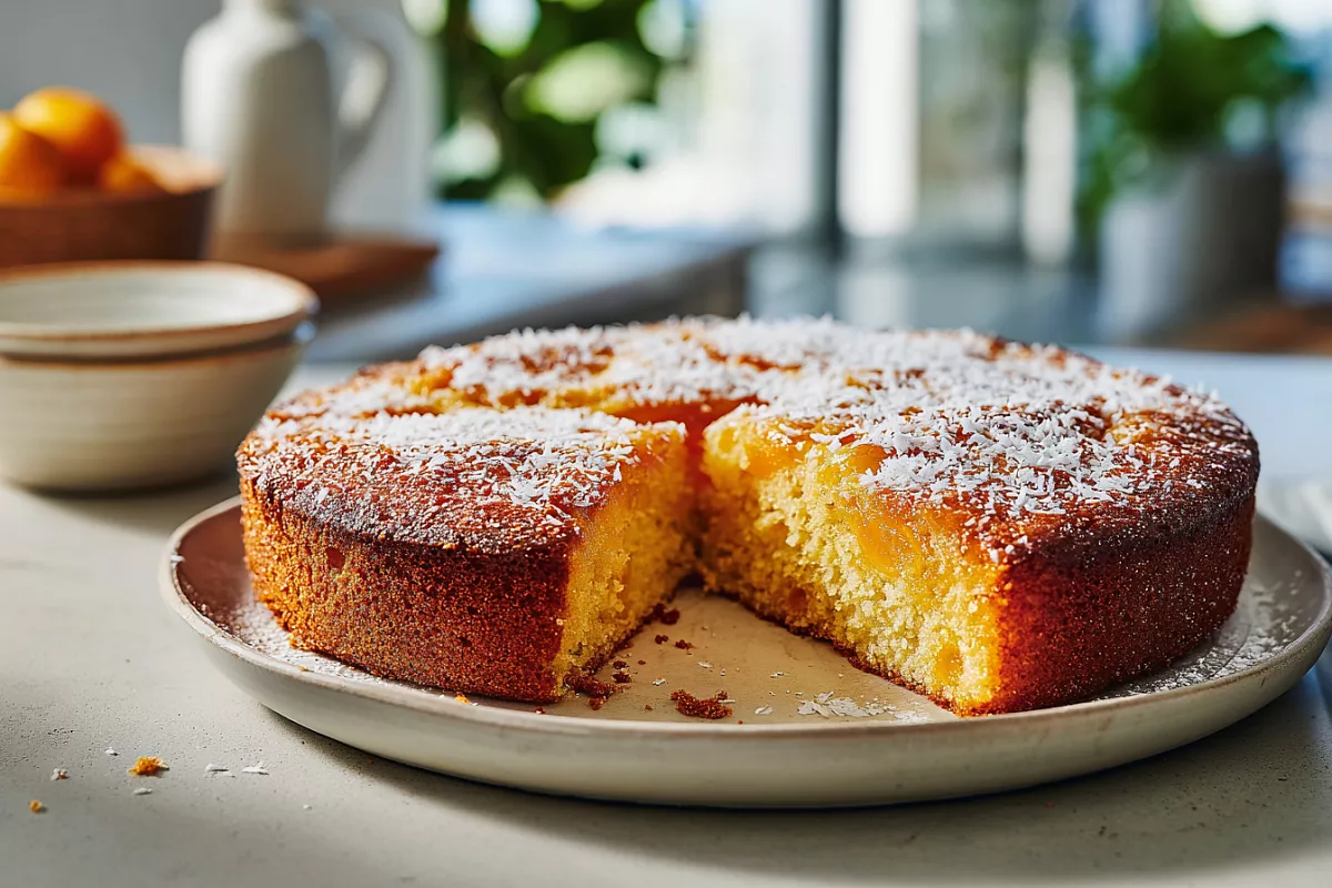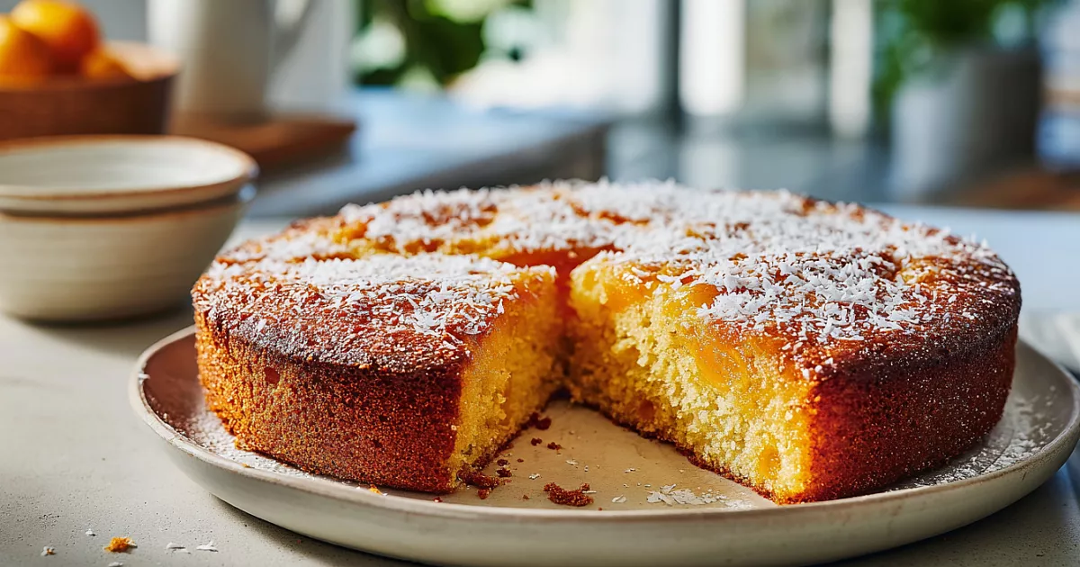 Возьмите форму диаметром 22–24 см. Если не уверены в ней, выстелите дно пергаментом. Выложите тесто, сверху слегка утопите консервированные фрукты (например, абрикосы). Для аромата посыпьте кокосовой стружкой — это по желанию. Выпекайте около 35 минут. Проверьте готовность зубочисткой, так как духовки разные.