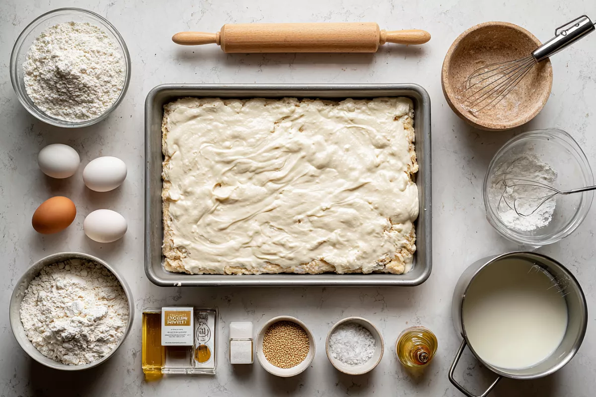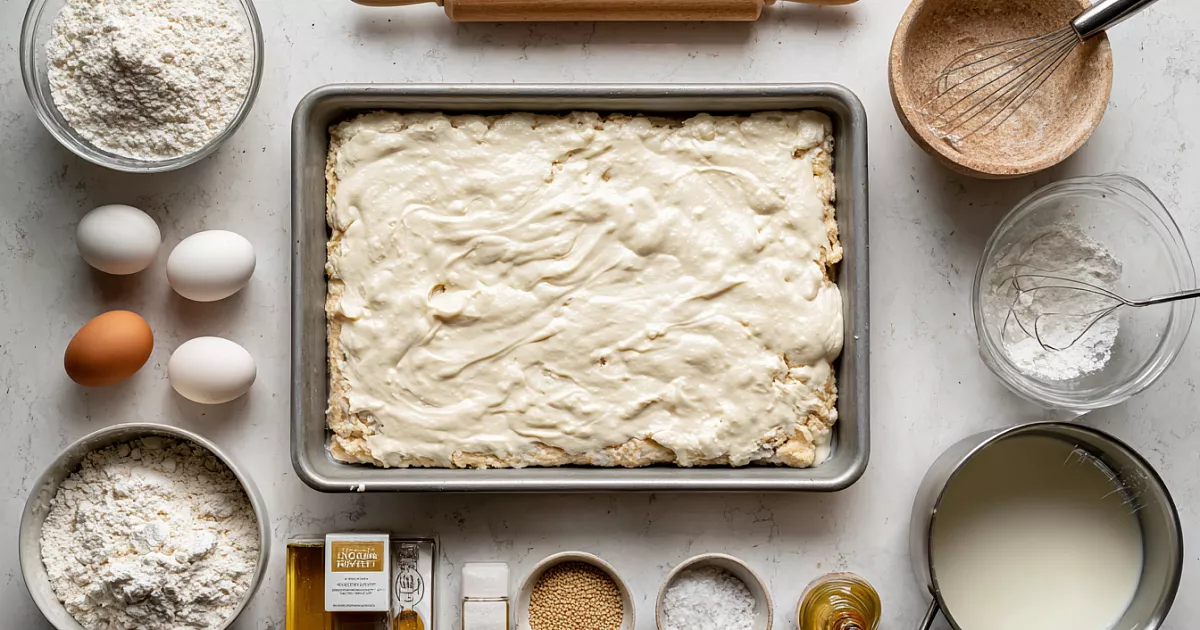 Противень 24 × 30 см застелите бумагой для выпечки. Вылейте немного теста и тонко распределите по дну — это нижний слой. Равномерно разложите начинку. Сверху прикройте тонким слоем теста, чтобы начинка скрылась. По желанию посыпьте кунжутом.